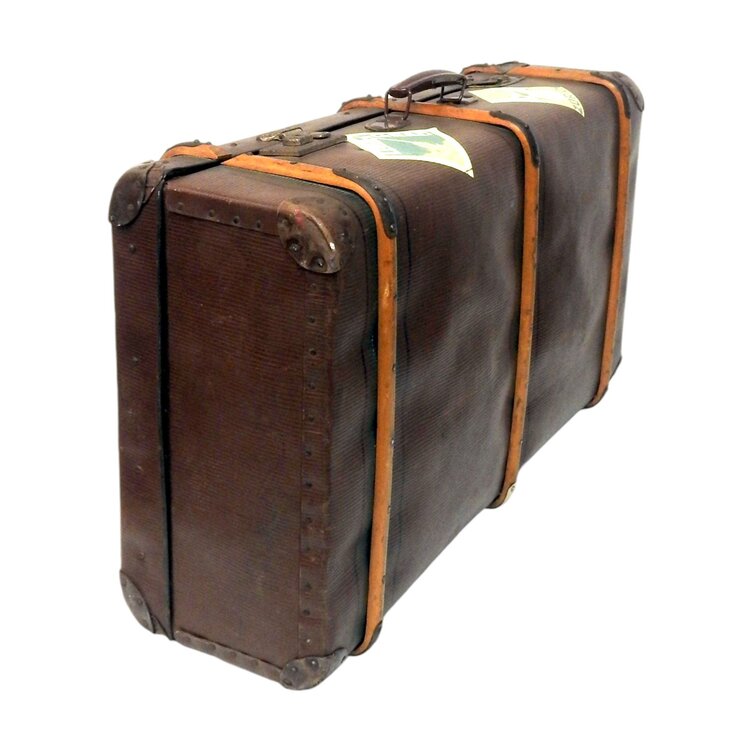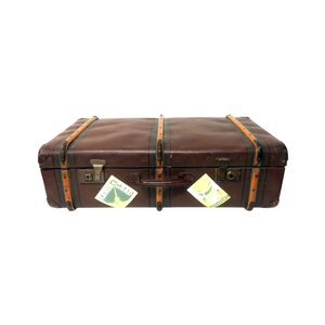 Fraaie vintage reiskoffer van sterk fiber, gewapend met houten ribben en metalen opzetstukken. Op de zijkant van de koffer zitten diverse stickers geplakt. Nostalgie! Datering: jaren vijftig van de 20ste eeuw. Conditie: redelijk goed. Afmetingen: lengte: 74 cm, hoogte 45 cm, diepte 24 cm.