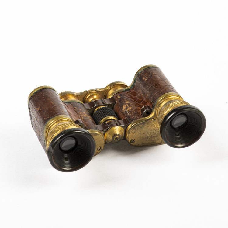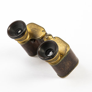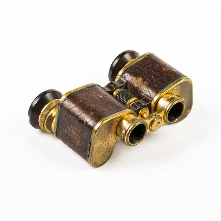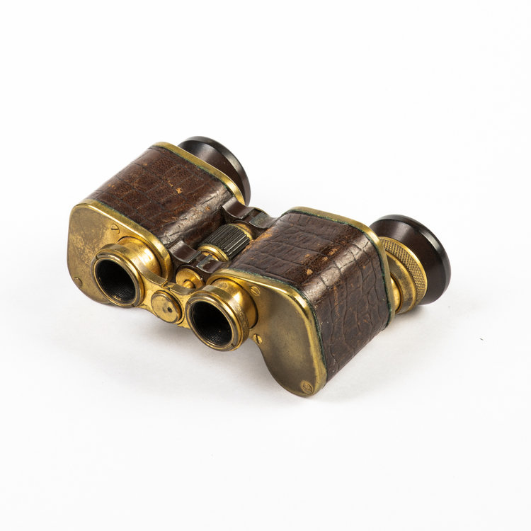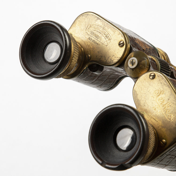 Toneelkijker met leer, 1850-1900. Geelkoper, bakelier en leer, 6.7 x 9.3 x 4 cm. De toneelkijker is gemerkt aan de voorzijde "Voigtländer Braunschweig No 73944, Perkev 3x". De toneelkijker is uniek vormgegeven waardoor deze meer op een traditionele verrekijker lijkt. Het is bedekt deels met donkerbruin leer en heeft bakelieten kijkgaten. De kijker bestaat uit twee delen die los van elkaar kunnen draaien om het midden. Conditie: prima tot redelijk, gebruikssporen en tekenen van ouderdom zoals lichte slijtage en oxidatie van het geelkoper en slijtage van het leer. Het bakeliet van het rechter kijkgat mist een schilfer. De beweegbare delen zitten wat los, waardoor een van de kijkgaten naar beneden zakt als hij aan één kant wordt vastgehouden. Het draaiwieltje werkt nog goed, verder in goede conditie.