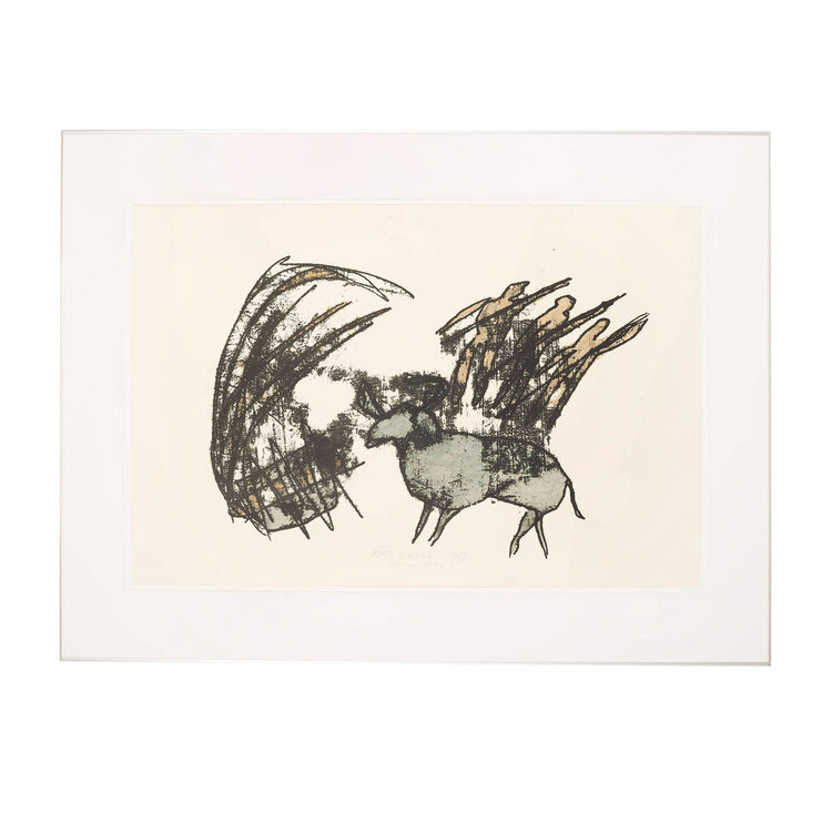 Wim Zurne, Samen sterk, 1992. Carborundumdruk op papier in metalen lijst. Abstracte afbeelding van een grijs dier met daarachter drie bruine figuren. Onderaan signatuur, jaar en titel. Conditie: gebruikssporen aan lijst. Afmeting lijst: 90 x 120 cm.