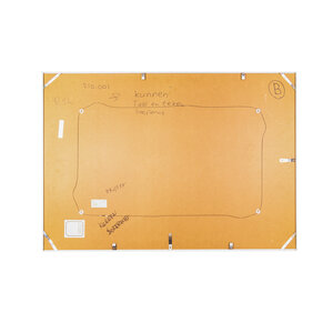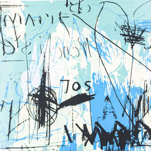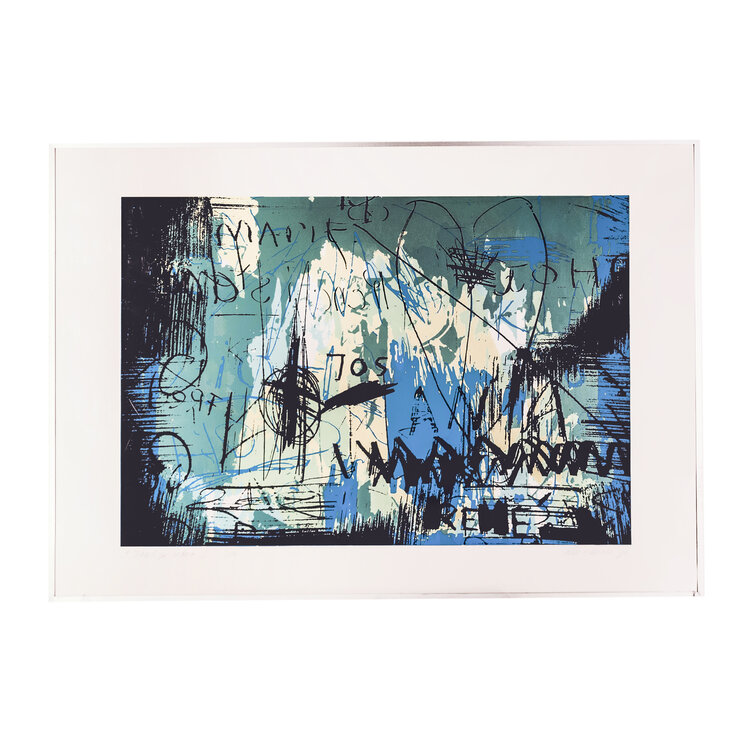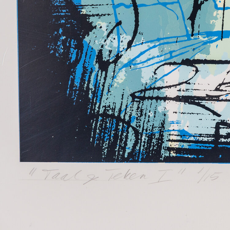 W.A. Kunnen, Taal en teken, 1990. Zeefdruk op papier in metalen lijst, oplage 1/15. Abstracte voorstelling in blauwtinten met in zwart letters, teksten en lijnen. Linksonder titel en oplagenummer, rechtsonder signatuur en jaartal. Conditie: goed, gebruikssporen aan lijst. Afmeting werk zonder lijst: 54 x 80 cm.