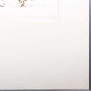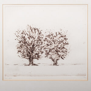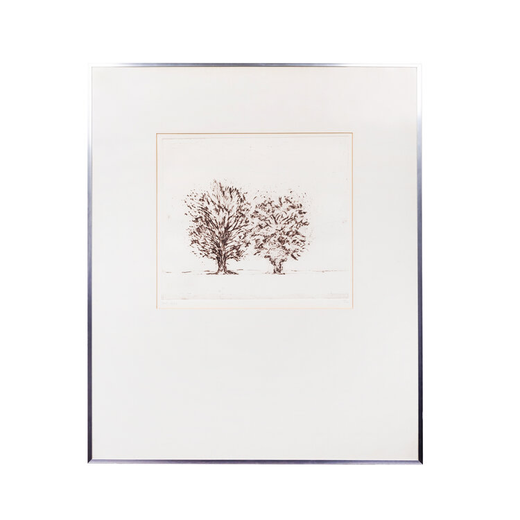 Wilfred Voet (Zeist, 1935), 'Twee bomen'. Ets oplage 10/30, in metalen lijst met passe-partout. Afbeelding van twee bomen in een landschap in bruintinten. Signatuur linksonder. Datering: 1977. Conditie: gebruikssporen lijst. Afmetingen lijst: 71 x 61 cm; beeldvlak: 28 x 34 cm.