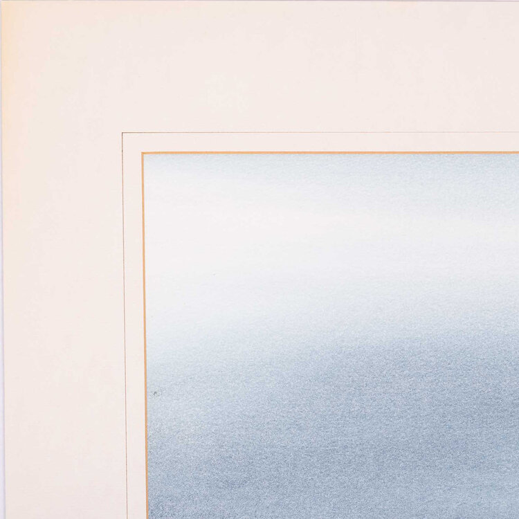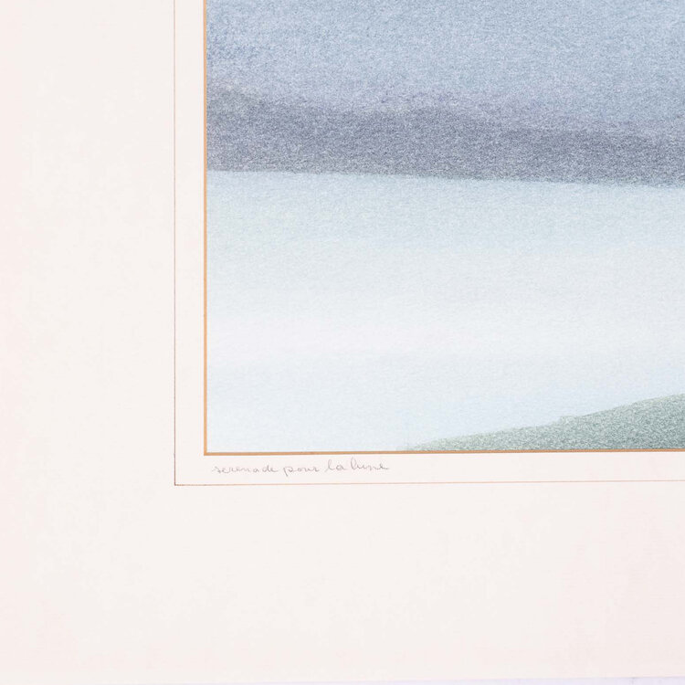 Will van Aggelen, Serenade pour la lune, jaartal onbekend. Aquarel in passe-partout zonder lijst. Afbeelding van een landschap met water in groen en blauw. Rechtsonder signatuur. Conditie: goed. Afmeting passe-partout: 50 x 65 cm.