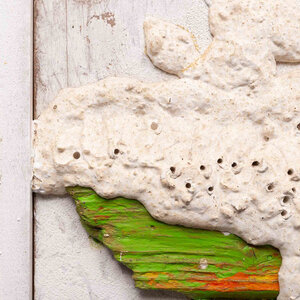 Willem Klein Schiphorst, Indian Summer, 1976. Gemengde techniek op paneel in houten lijst. Sculpturale abstracte compositie van houten elementen die met metalen nagels op een paneel bevestigd zijn. Met rood, geel en groen zijn er accenten in het werk aangebracht. Over het hout is een organische vorm van gips aangebracht, die deels gekleurd is. Om het werk zit de originele wit geschilderde houten omlijsting. Rechtsonder gesigneerd met 'KS 76'. Conditie: de lijst toont hier en daar wat gebruikssporen, zoals tape aan de onderzijde. Het is hier en daar wat vuil, maar verder in goede staat. Afmetingen lijst: 52 x 45 x 8 cm.