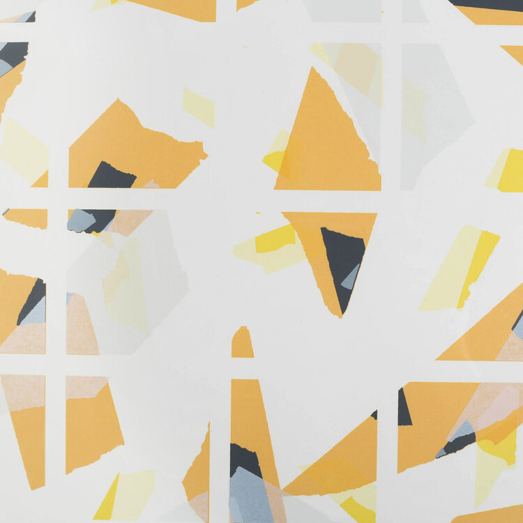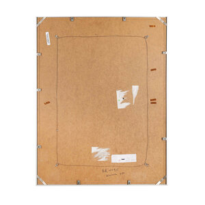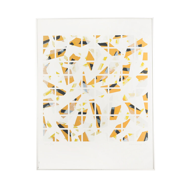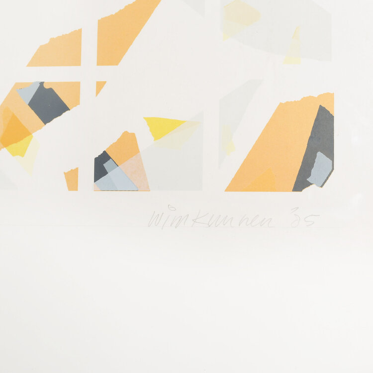 Wim Kunnen, Z.T., 1985. Zeefdruk op papier in metalen lijst, oplage 9/20. Abstracte compositie in een kader van oranje, zwarte en gele vormen met een wit rasters. Linksonder Z.T. en oplagenummer, rechtsonder signatuur en jaartal. Conditie: goed, gebruikssporen aan lijst. Afmeting werk zonder lijst: 92 x 71 cm; incl. lijst: 91 x 71 cm.