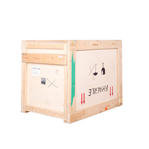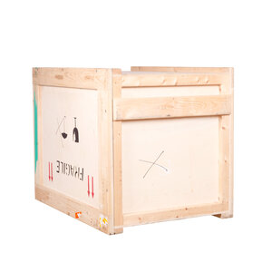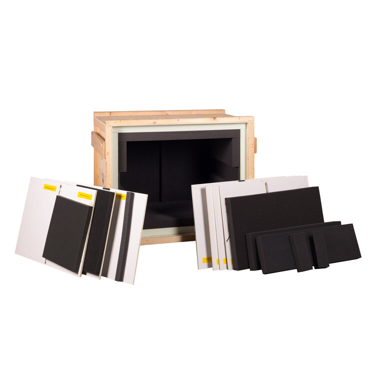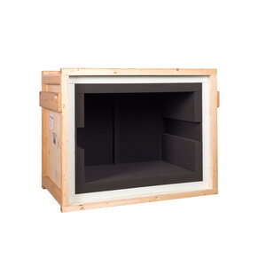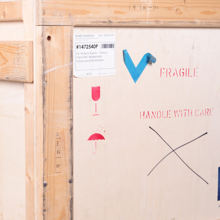 Houten kist voor kunsttransport, 21ste eeuw. De wanden zijn aan de binnenkant bekleed met schuim. In de kist zitten schotten en stukken schuim. De kist is gebruikt door het Nederlands Fotomuseum in Rotterdam voor het veilig vervoeren van collectiemateriaal. Conditie: gebruikt. Afmetingen: buitenmaat ca. 72 x 93 x 67 cm; binnenmaat ca. 47 x 66 x 48 cm.