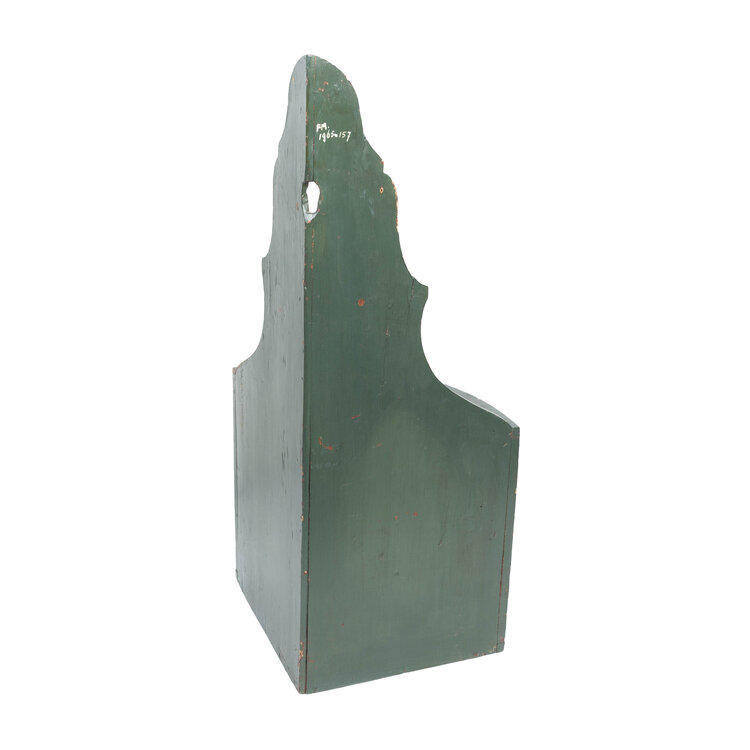 Groen houten hoekkastje met ronde voorkant en golvende zijkanten. Het kastje heeft drie plankjes en onder een opbergruimte met een jaloezieschuifdeurtje. Het meubel is afkomstig van Stichting Hora Siccama van de Harkstede. Datering: onbekend. Conditie: schuifdeurtje is kapot, barsten in hout, verf is beschadigd. Een leuke restauratieklus voor de liefhebber! Afmetingen: ca. 78 x 39,5 x 30 cm.