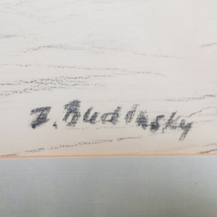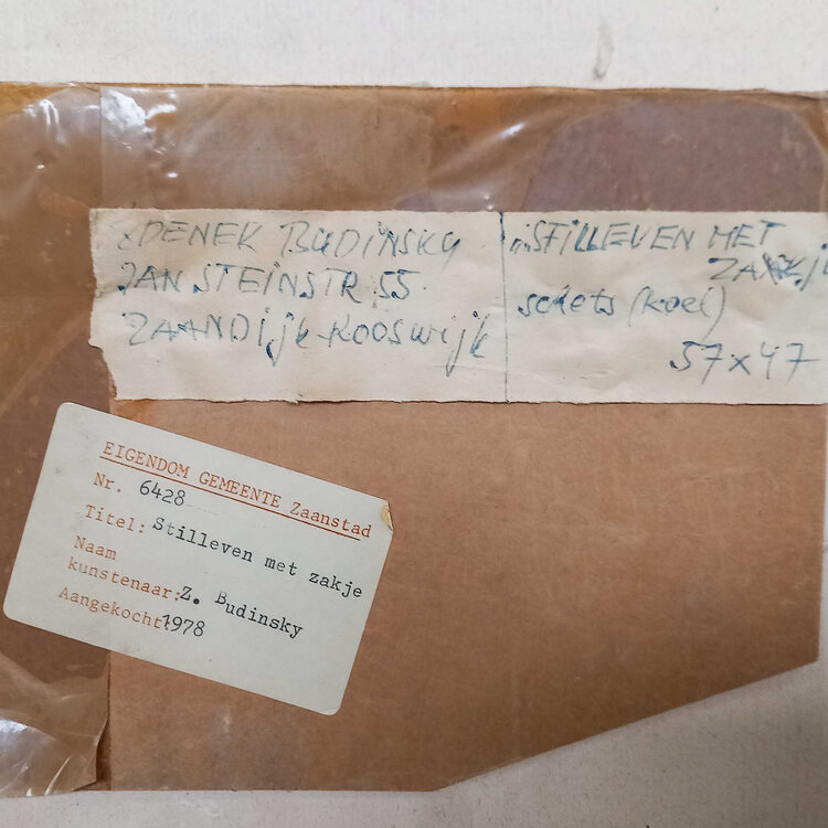 Zdenek BudinskyÃÅ, Stilleven met zakje, jaartal onbekend. Houtskooltekening ingelijst met passe-partout. Stilleven met diverse objecten op tafel, waaronder een zakje en eierdop met ei. Signatuur rechtsonder. Conditie: redelijk; zure omgeving, lijst gebruikssporen, glas vies, stickerresten. Afmetingen: ca. 61 x 70 x 1,5 cm.