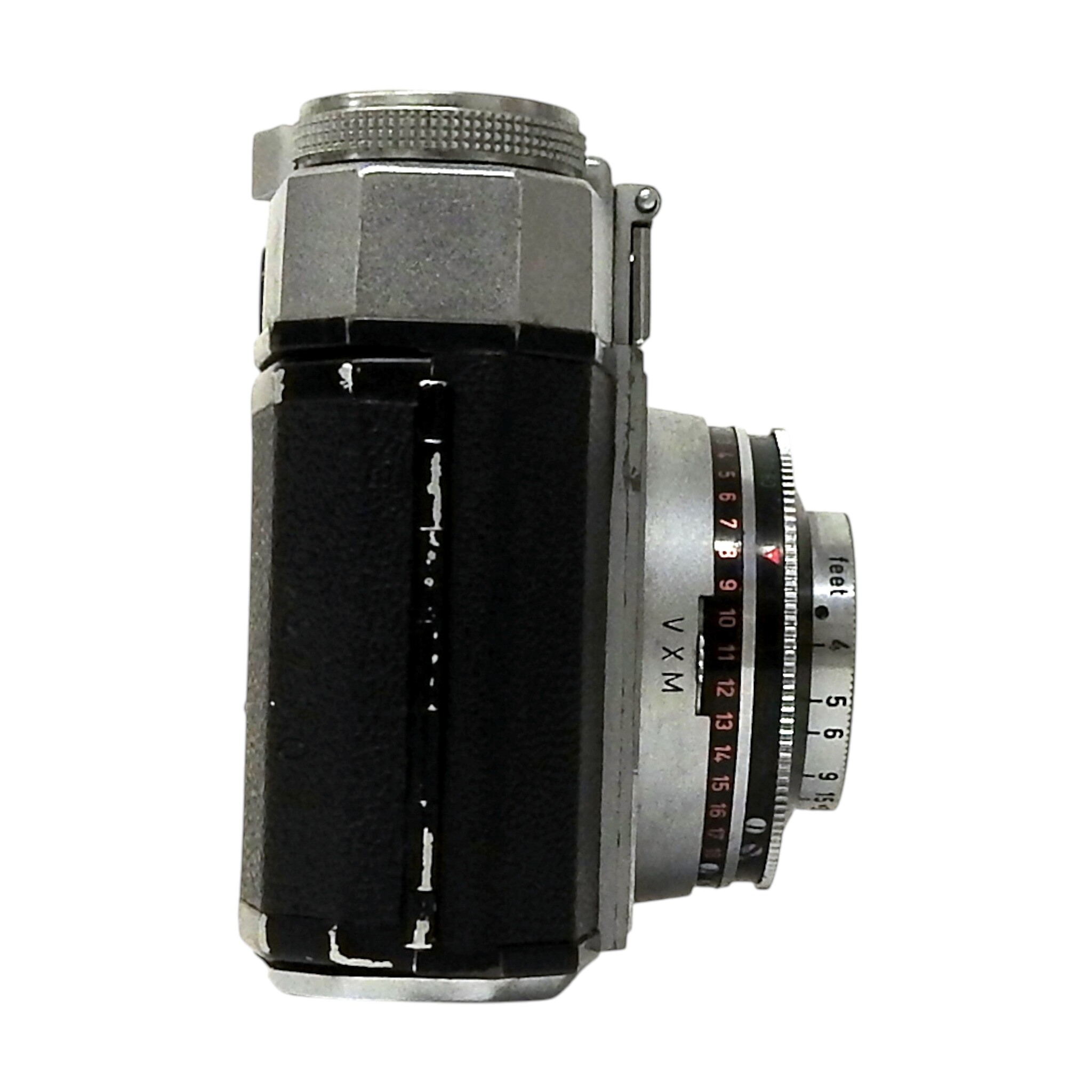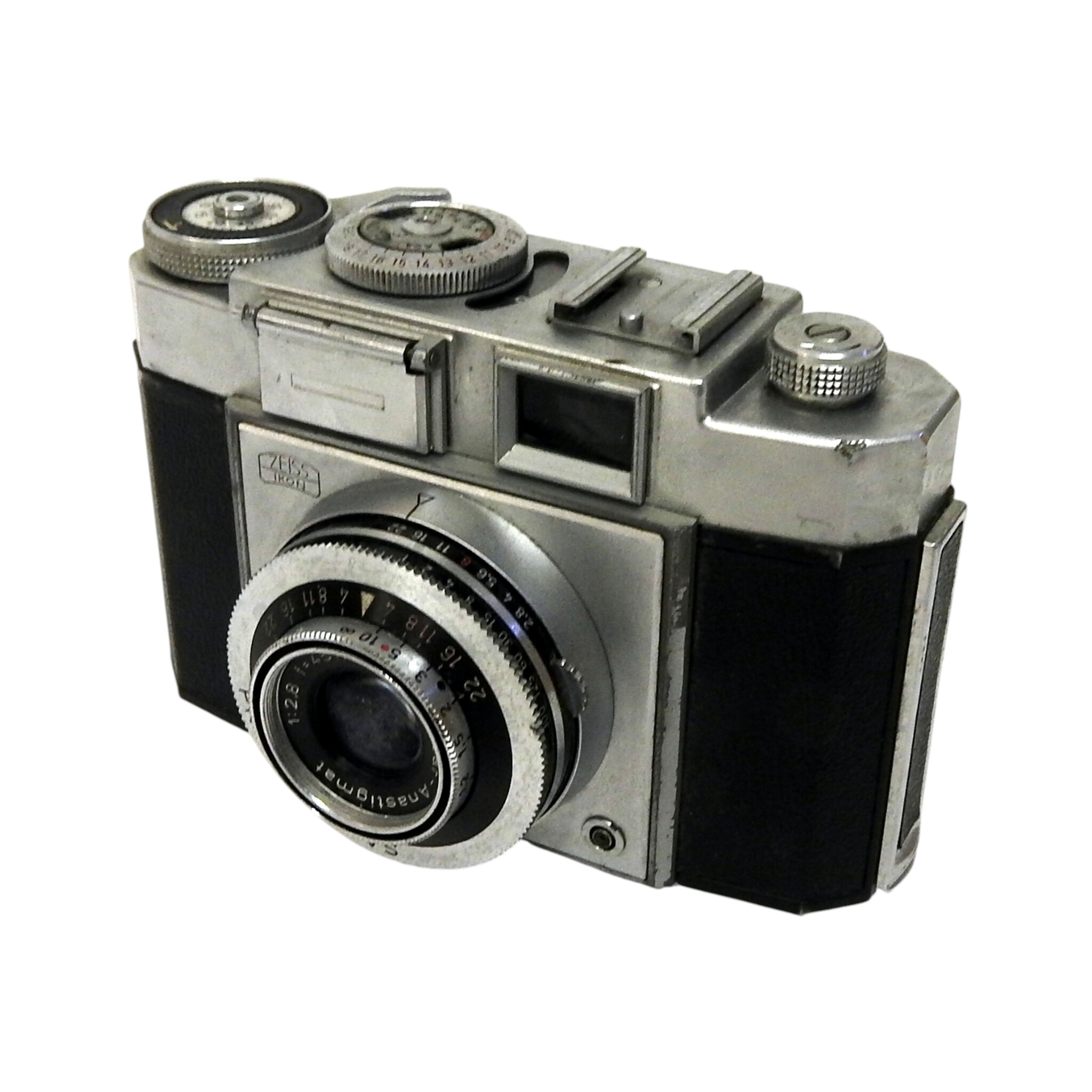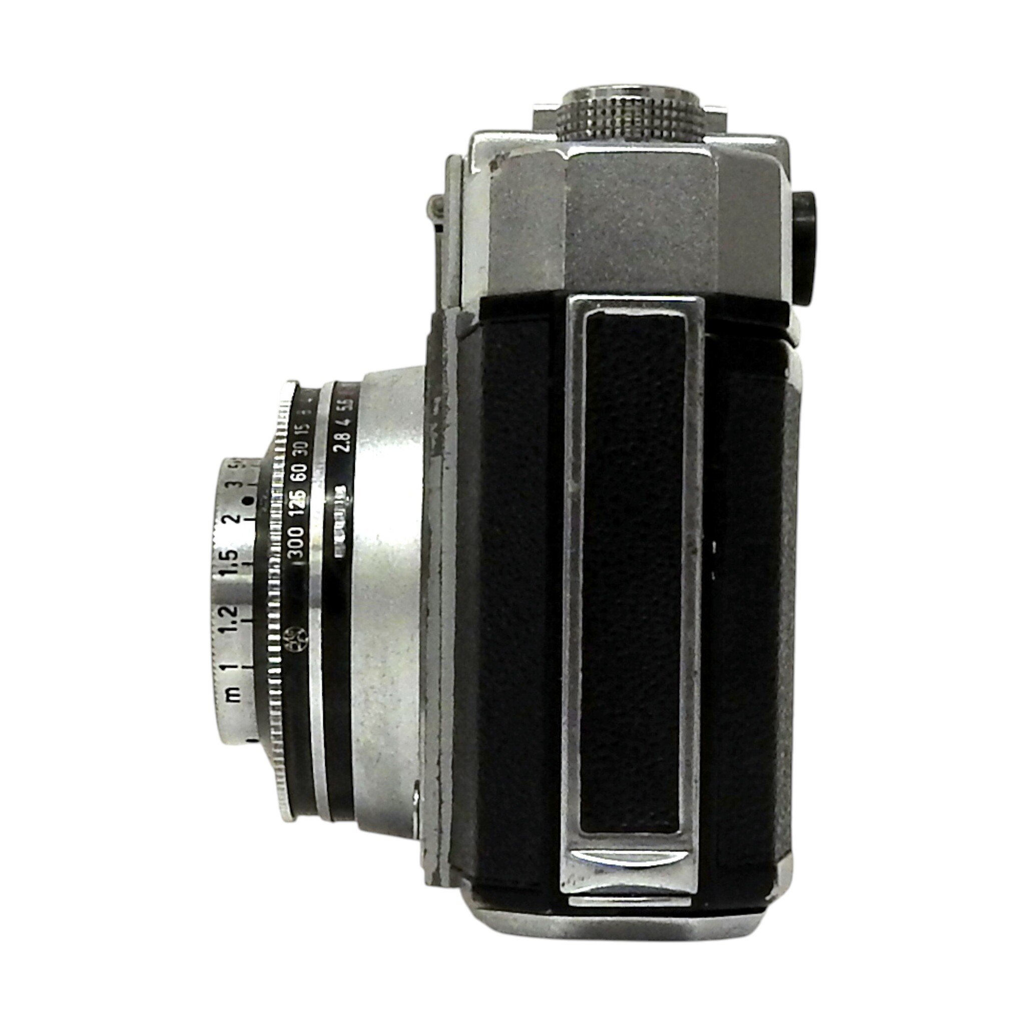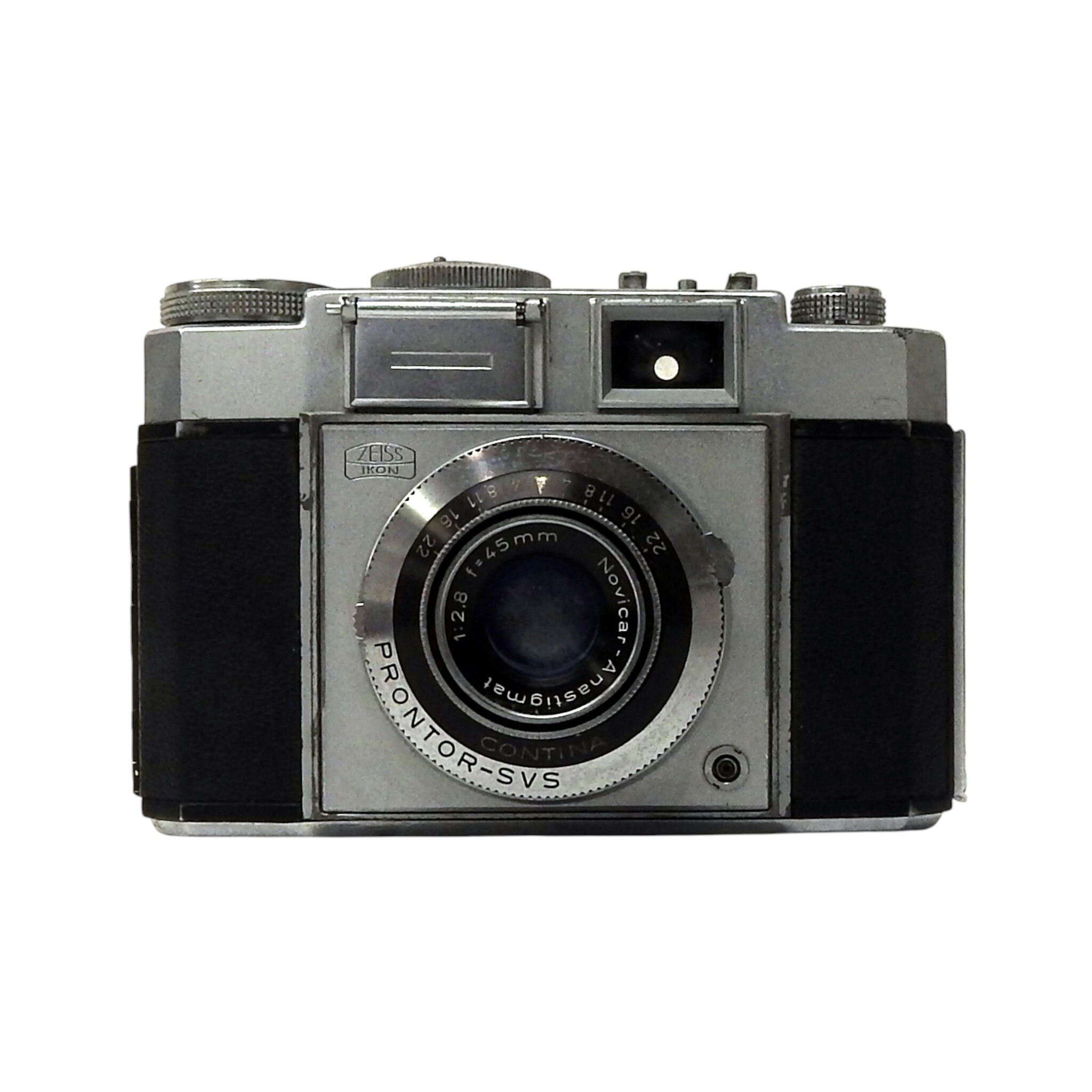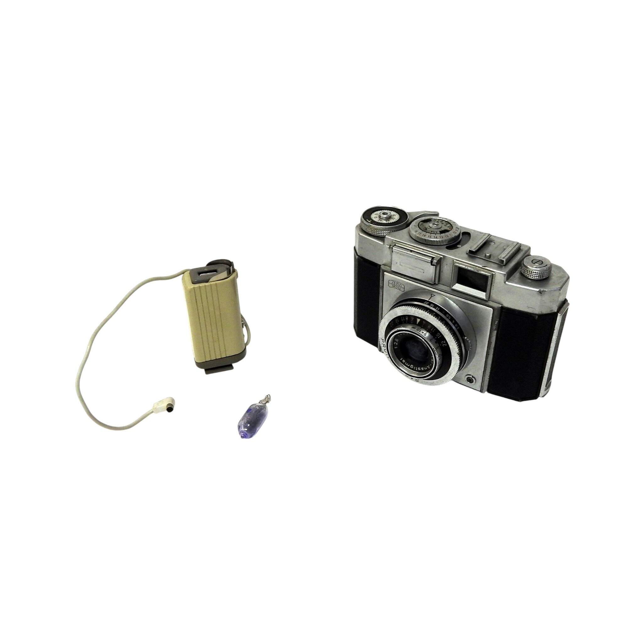 Zeiss Ikon Contina kleinbeeldcamera met Emo compact flitsapparaat. Bouwjaar 1956-1958. Conditie: Behuizing heeft lichte gebruiksporen. Werkt goed. Afmetingen: H. 8.5 cm, Br. 12 cm, D. 6.5 cm.