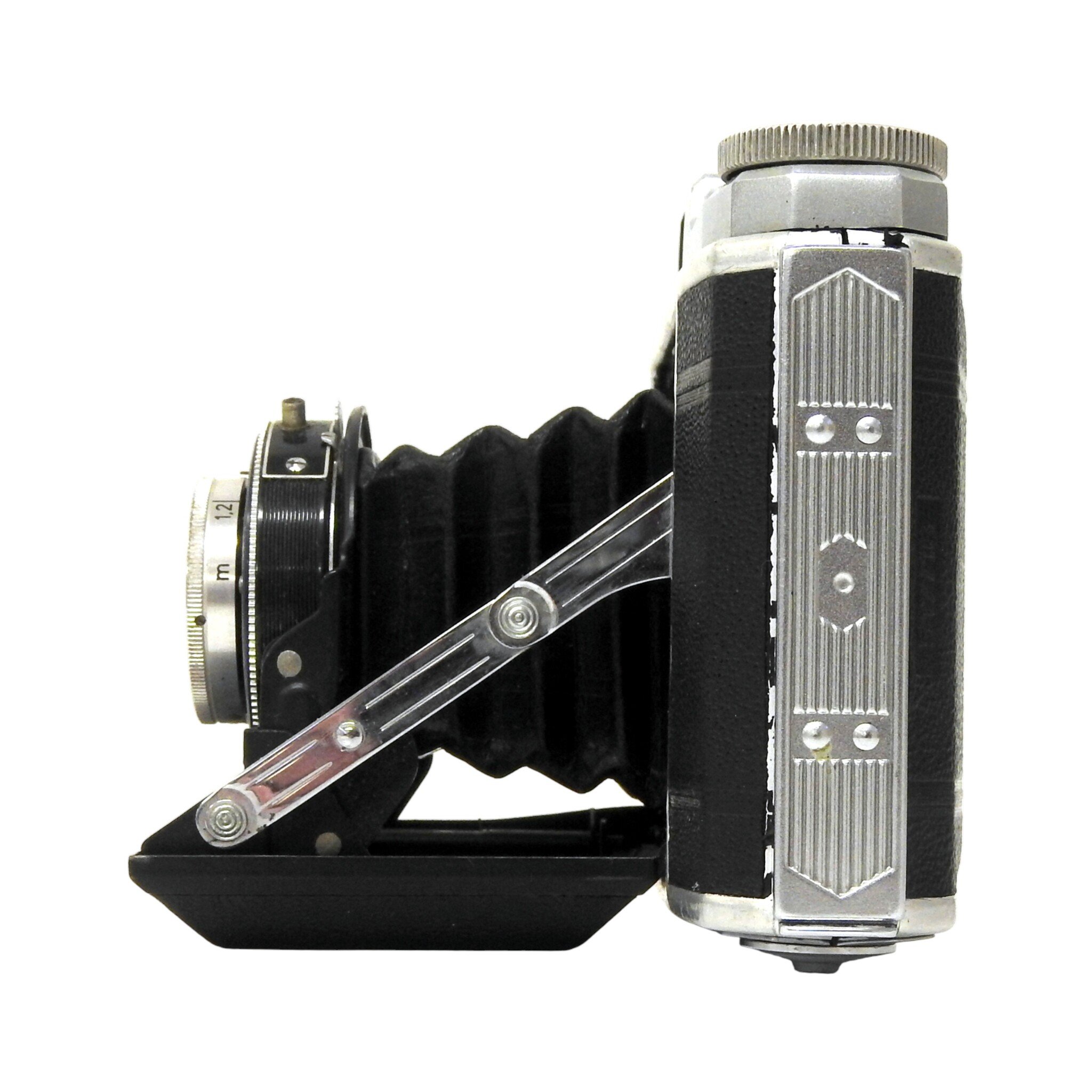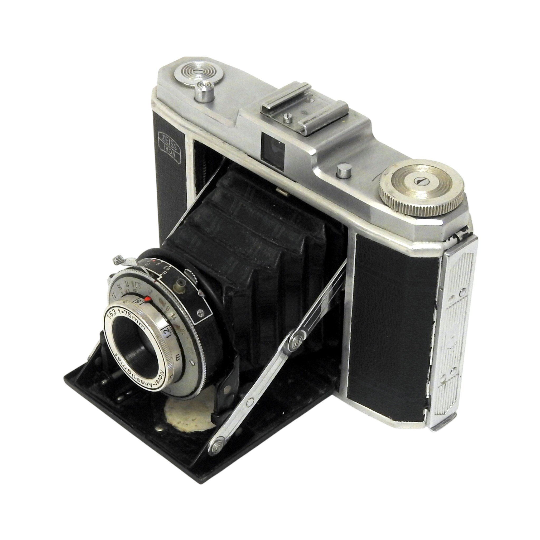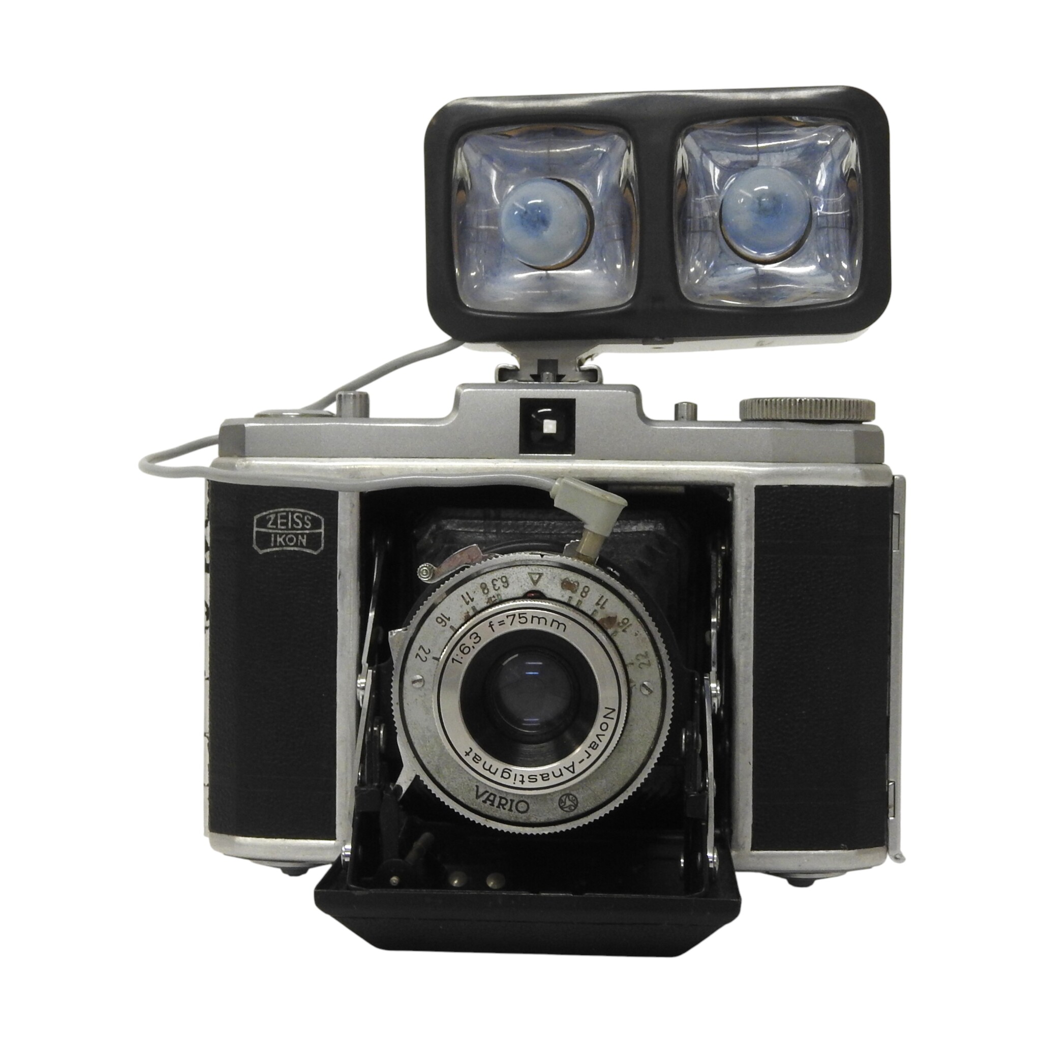 Zeiss Ikon Nettar 6 x 6 balgcamera met flitsapparaat voor twee lampjes. Bouwjaar camera van 1949 tot 1957. Conditie: Sluiter werkt niet meer. Alleen geschikt als vitrineobject. Afmetingen: H. 10 cm, Br. 13 cm, D. 9 cm.