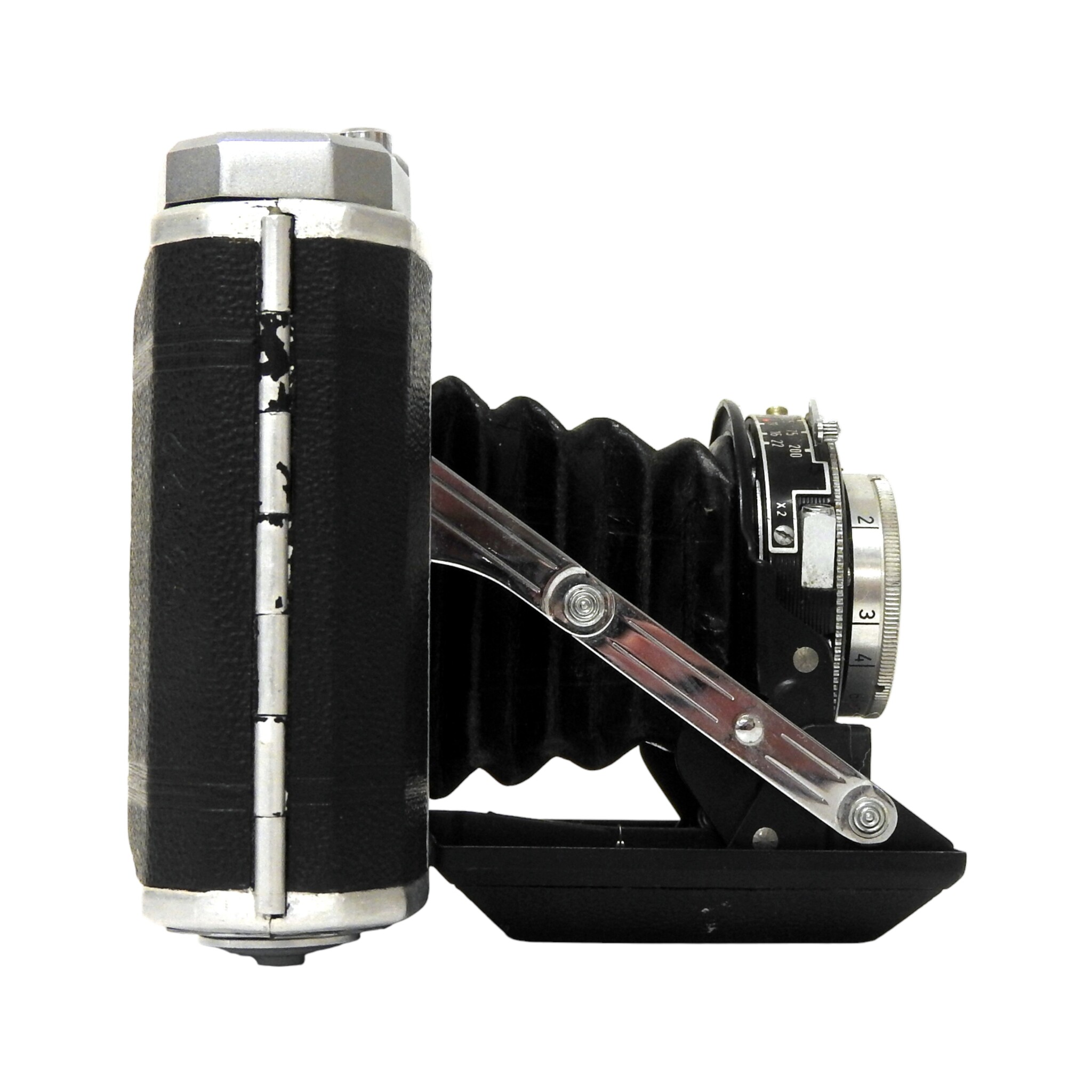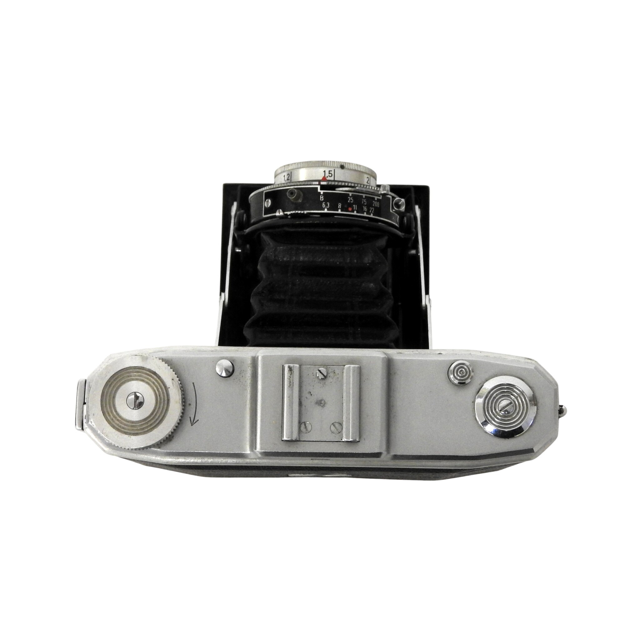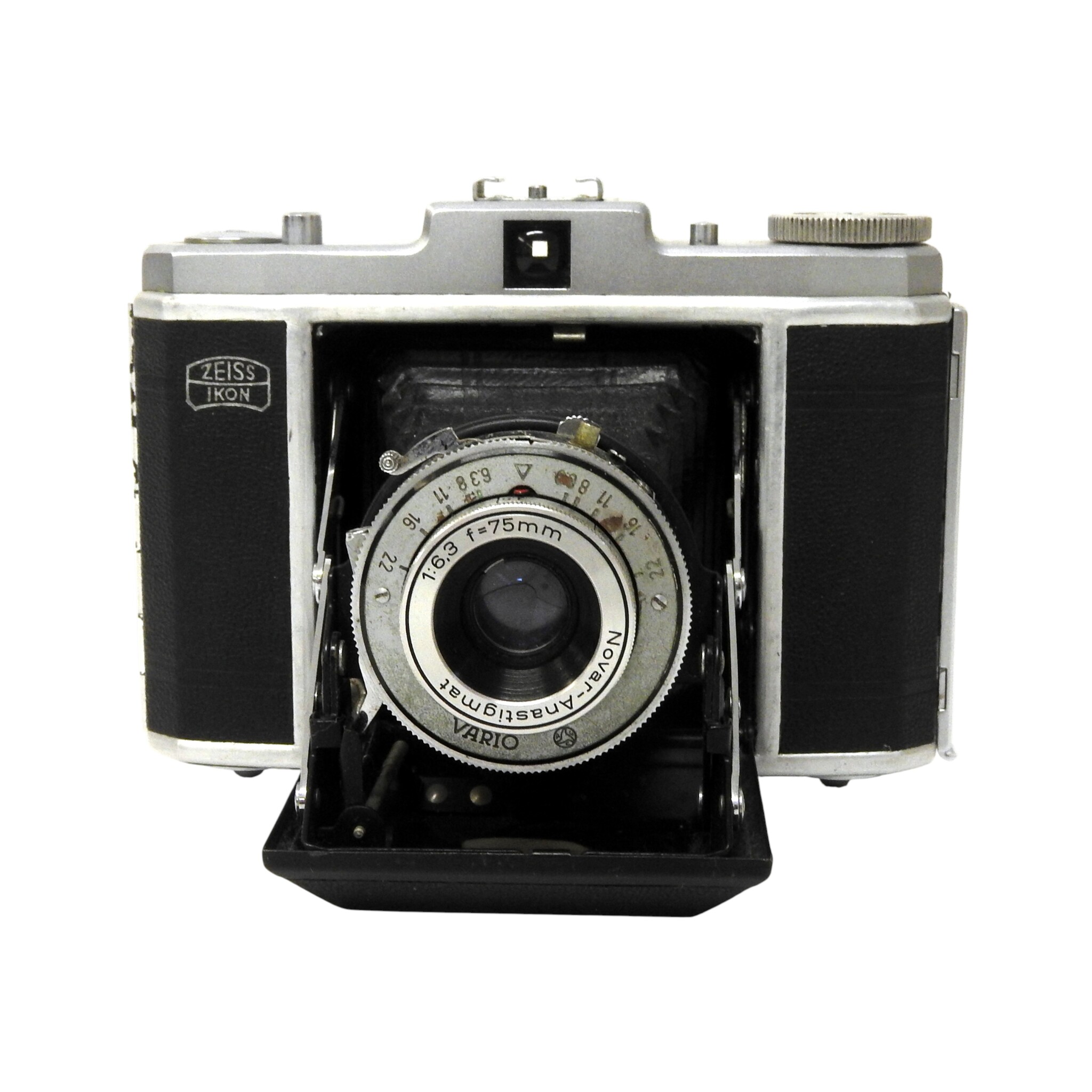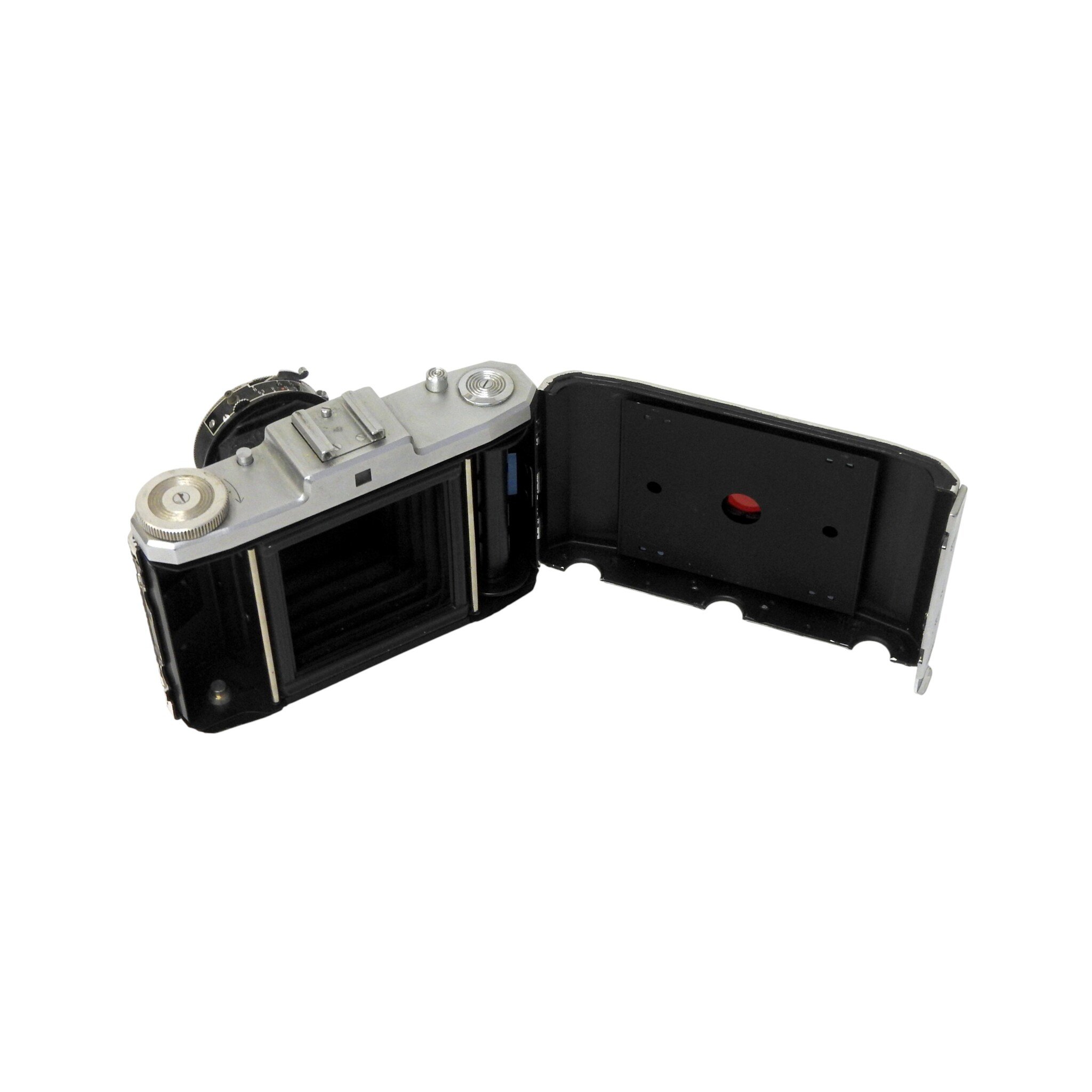 Zeiss Ikon Nettar 6 x 6 balgcamera met flitsapparaat voor twee lampjes. Bouwjaar camera van 1949 tot 1957. Conditie: Sluiter werkt niet meer. Alleen geschikt als vitrineobject. Afmetingen: H. 10 cm, Br. 13 cm, D. 9 cm.