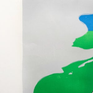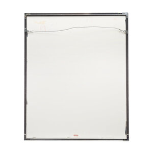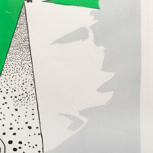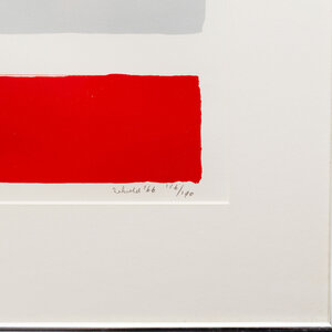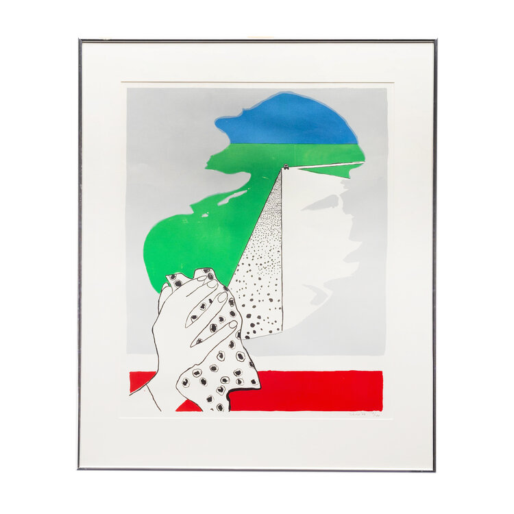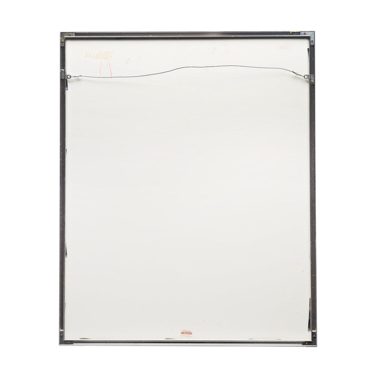 Zekveld, Beslagen ruit, 1966. Kleurenlitho in zilverkleurige lijst, oplage 116/190. Afbeelding van een hand met een doekje die de condens van een ruit weg veegt, in de ruit komt een zicht op een landschap met weg zichtbaar. Rechtsonder signatuur, jaar en oplagenummer. Conditie: het werk is in goede staat, de lijst toont hier en daar gebruikssporen. Afmeting lijst: 83 x 68 cm.