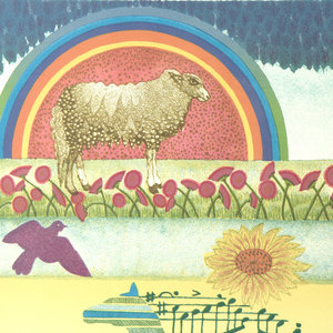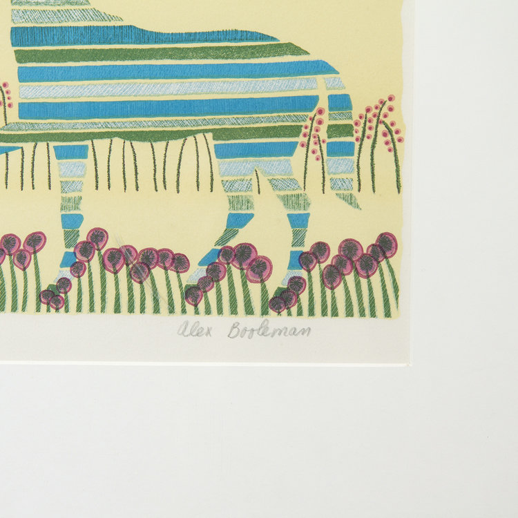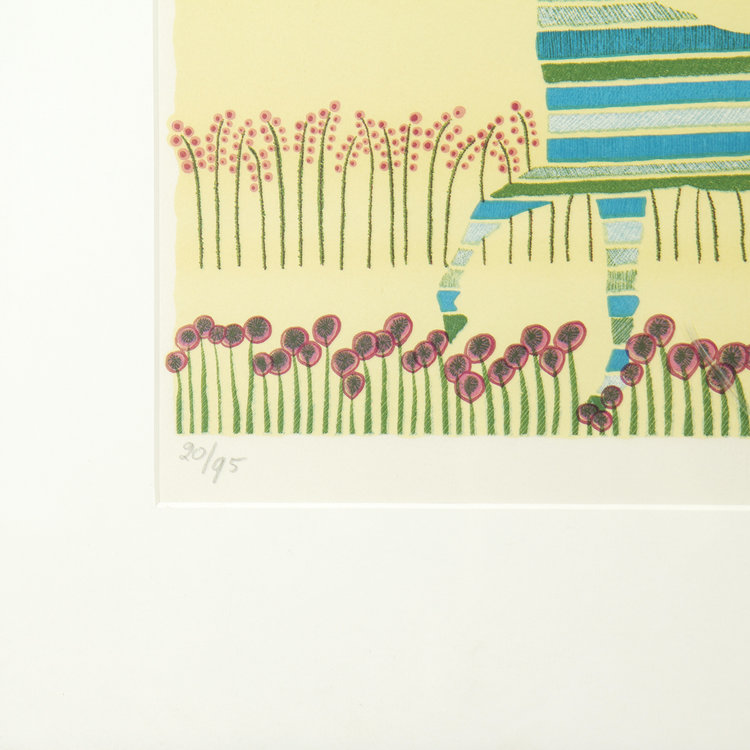 Alexandrina Booleman, Mars van Bach, 1983. Zeefdruk op papier in houten lijst, oplage 20/95. Kleurrijke voorstelling met schaap in een bloemenveld met op de achtergrond een regenboog, daaronder een vogel en paard. Linksonder oplagenummer en rechtsonder gesigneerd. Conditie: goed, linksboven watervlek op lijst en passe-partout. Afmeting werk zonder lijst: 51 x 35 cm.