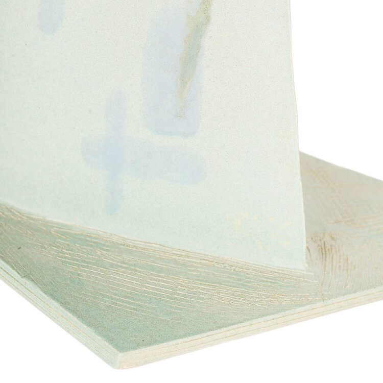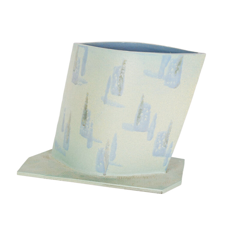 A. de Graaf- v.d. Gaag, Vleugelsculpture turquoise, jaartal onbekend, steenplastiek. Hol turquoise scultpuur met blauwe versieringen. Op de basis zijn in relief geometrische lijnen aangebracht. Conditie: lichte gebruikssporen. Afmeting: H27 x B35 x D21 cm.