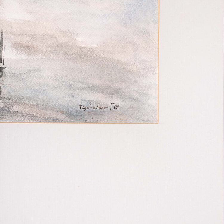 A. Tigchelaar, Landschap, 1981. Aquarel in passe-partout zonder lijst. Afbeelding van riet aan de linkerkant van de waterkant. Linksonder signatuur. Conditie: goed. Afmeting passe-partout: 65 x 50 cm.
