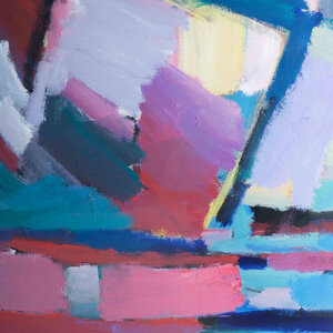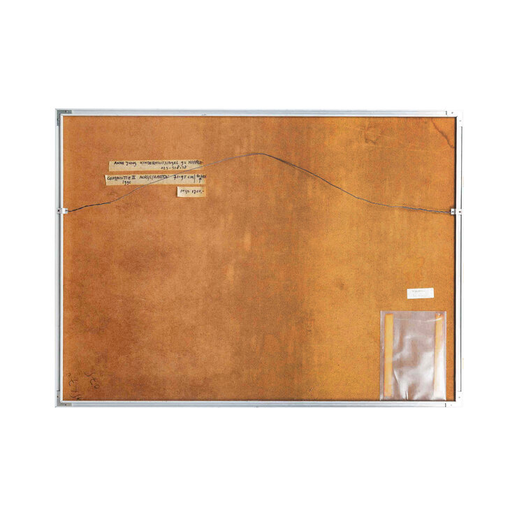 Anne Jung, 'Compositie II', 1990. Acrylverf op papier in witte lijst. Kleurrijke abstracte compositie van vlakken en lijnen. Signatuur rechtsonder. Conditie: werk is in goede staat, lijst toont wat gebruikssporen. Afmetingen lijst: 70 x 95 cm.