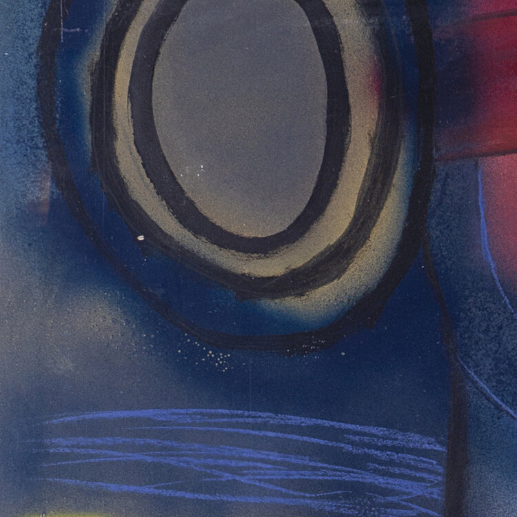 Abstract werk met donkere kleuren door Annemarie Ravenstein. Gemengde techniek op papier, met hout en plastic omlijst. Gedateerd en gesigneerd. Datering: 1984. Conditie: het werk is in goede staat de plastic omlijsting is lichtbeschadigd. Afmetingen: 100 x 75 cm.