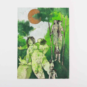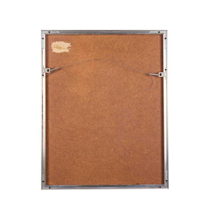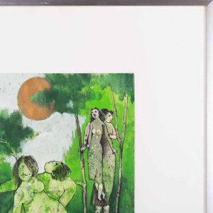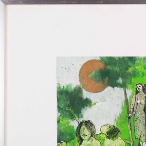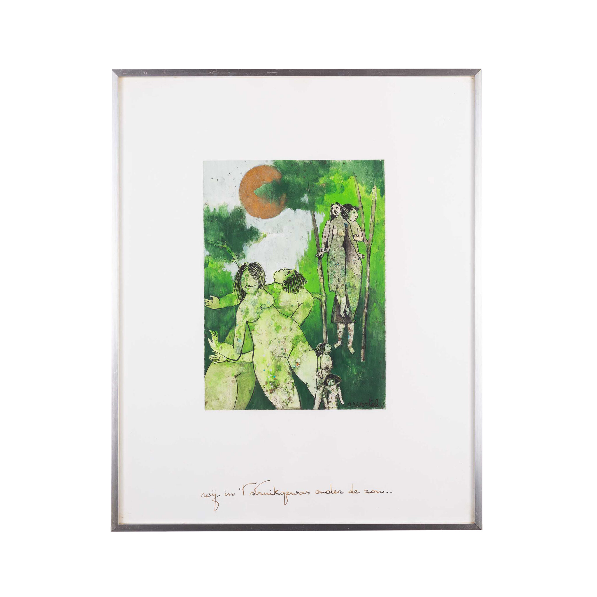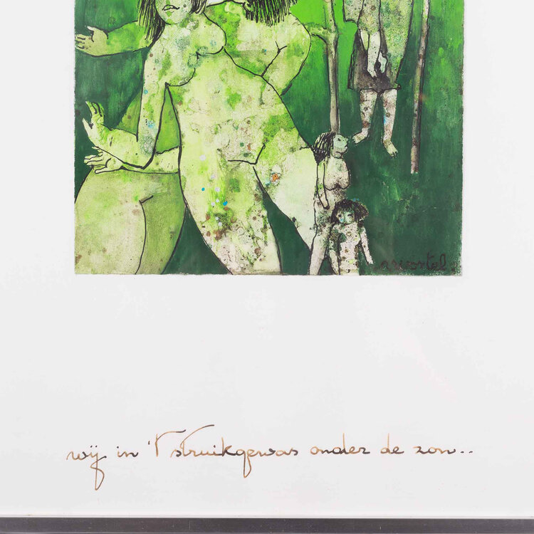 Ans Wortel, 'Wij in 't struikgewas onder de zon', jaartal onbekend. Gouache op papier in zilverkleurige lijst. Voorstelling van een groep naakte mensen tussen de bomen, linksboven een gouden zon. Linksonder gesigneerd met 'a wortel.' Onderaan de teskt: "Wij in 't struikgewas onder de zon.." Een boek over het werk van de kunstenaar wordt meegeleverd. Conditie: goed, met lichte gebruikssporen. Afmetingen incl lijst ca.: 50,5 x 40,5 cm.