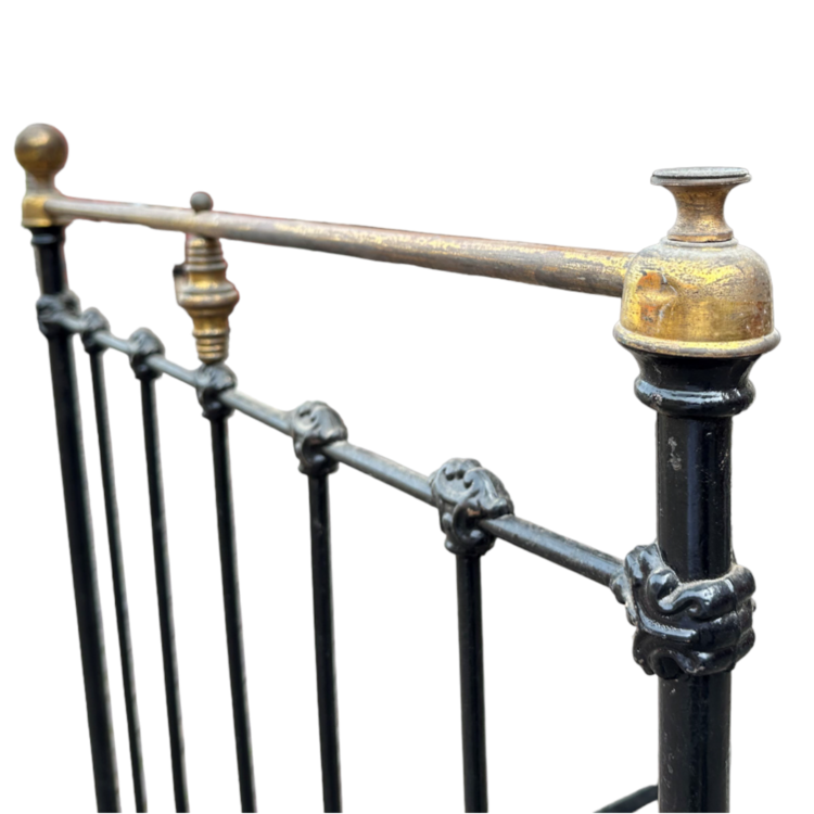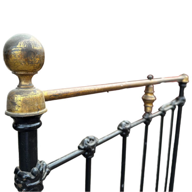 Antiek giet ijzeren spijlenbed (zwart) met messing versiering. Het heeft oorspronkelijk springveren gehad zodat de zijsteunen heel zwaar zijn uitgevoerd. Datering: eind 19e eeuw. Conditie: Messing knoppen verschillen en zijn verweerd; één knop ontbreekt. Heeft de tand des tijds doorstaan maar moet opgeknapt worden. Afmetingen: ca. h 136 x b 90 x l 200 cm. Hoofd en voeteneinde zijn even hoog 130 cm, plus de koperen knop van ongeveer 6 cm. De lange ijzeren zijsteunen zitten ongeveer 30 cm van de grond en meten ca. 185 cm.