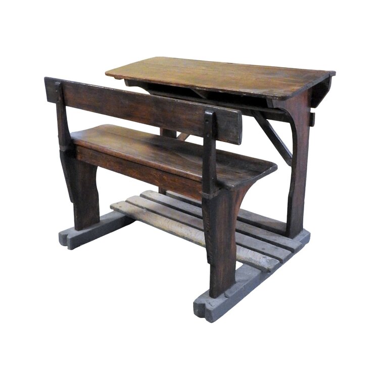 Antiek tweepersoons schoolbankje. Het bankje is geheel van hout met ingebouwd inktpotje en voetenplankje. Datering: begin 20ste eeuw. Conditie: vertoont gebruikssporen. Afmetingen: breed 117 cm, hoog 90 cm, diep 80 cm.