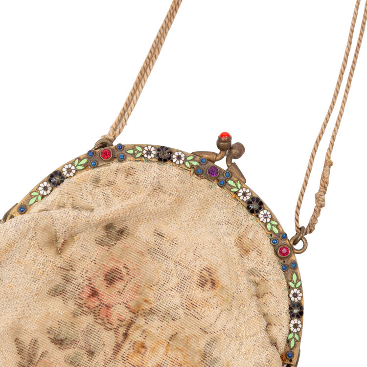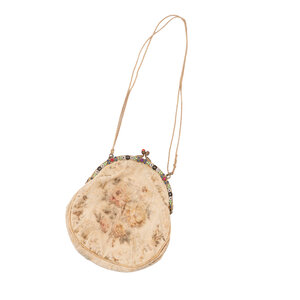 Antiek tasje met handschoentjes en waaierset, eind 19e/begin 20ste eeuw. Het kleine crèmekleurige tasje met bloempatroon heeft een metalen beugel. Deze is aan de voorzijde versierd met gekleurde steentjes en aan de beugel zit een koordje. De binnenzijde heeft een groene voering met opbergzakje; Een paar crèmekleurige leren handschoentjes met drukknopjes (maat 7); De waaierset bestaat uit meerder bladen die zijn versierd met gestanste patronen. De bladen kunnen aan elkaar geregen worden met een lint. Conditie: vertonen sporen van gebruik en ouderdom, zoals slijtageplekken. Bovenop de sluiting ontbreekt een rood steentje. Afmetingen tasje: 13 x 12 x 1 cm; hoogte met hengsel 32 cm. Afmetingen handschoenen: ca. 23 x 7 cm. Afmetingen waaierbladen: ca. 17 x 0,5 / 1,5 cm.