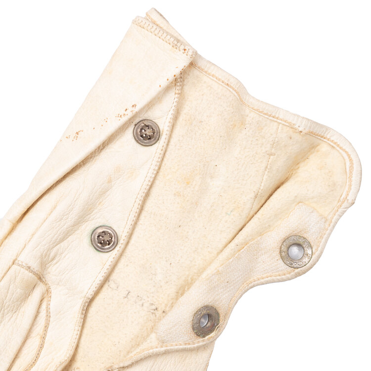 Antiek tasje met handschoentjes en waaierset, eind 19e/begin 20ste eeuw. Het crèmekleurige tasje met bloempatroon heeft een metalen beugel; Een paar crèmekleurige leren handschoentjes met drukknopjes (maat 7); De waaierset bestaat uit meerder bladen die z