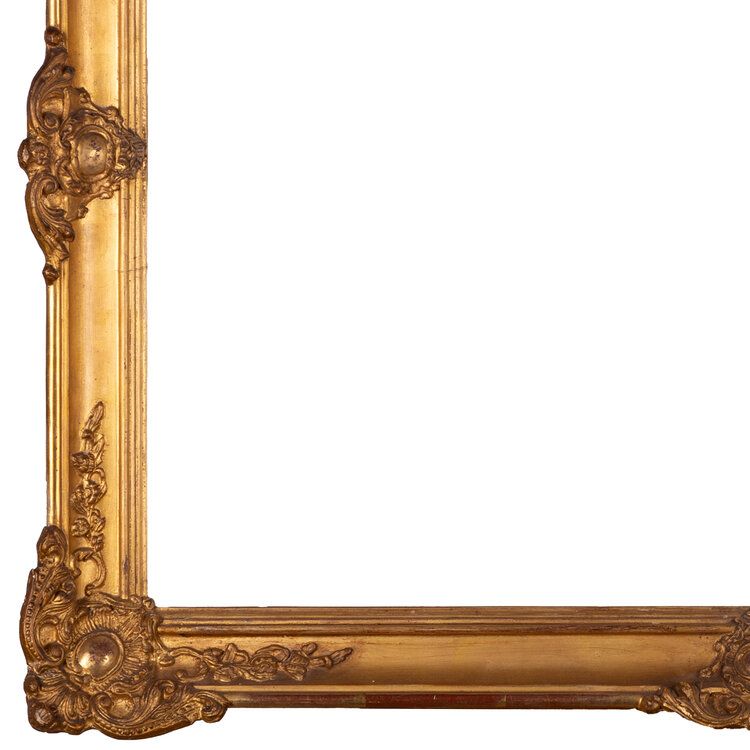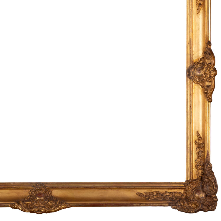 Antieke goudkleurige lijst; ca. 66 x 85 x 6,6 cm. Antieke goudkleurige houten lijst, rijkelijk versierd met ornamenten in het midden van de randen en in de hoeken. De lijst heeft gehangen in Het Scheepvaartmuseum in Amsterdam. Datering: eind 19e / begin 20ste eeuw. Conditie: vertoont sporen van gebruik en ouderdom. Afmetingen: Buitenmaat ca. 66 x 85 x 6,5 cm; Binnenmaat ca. 57 x 75 cm.