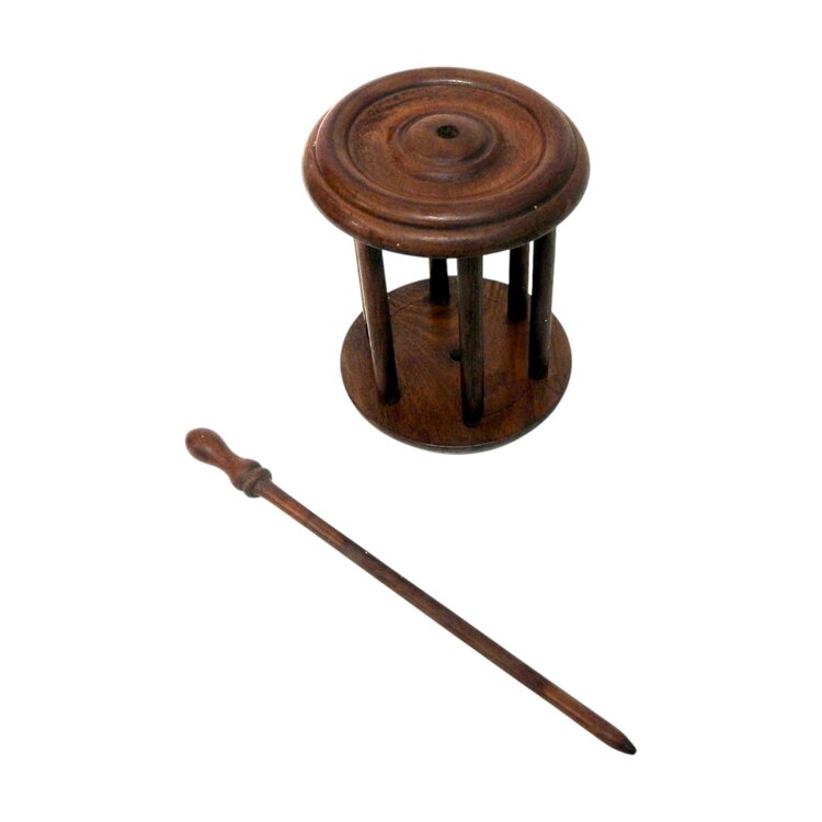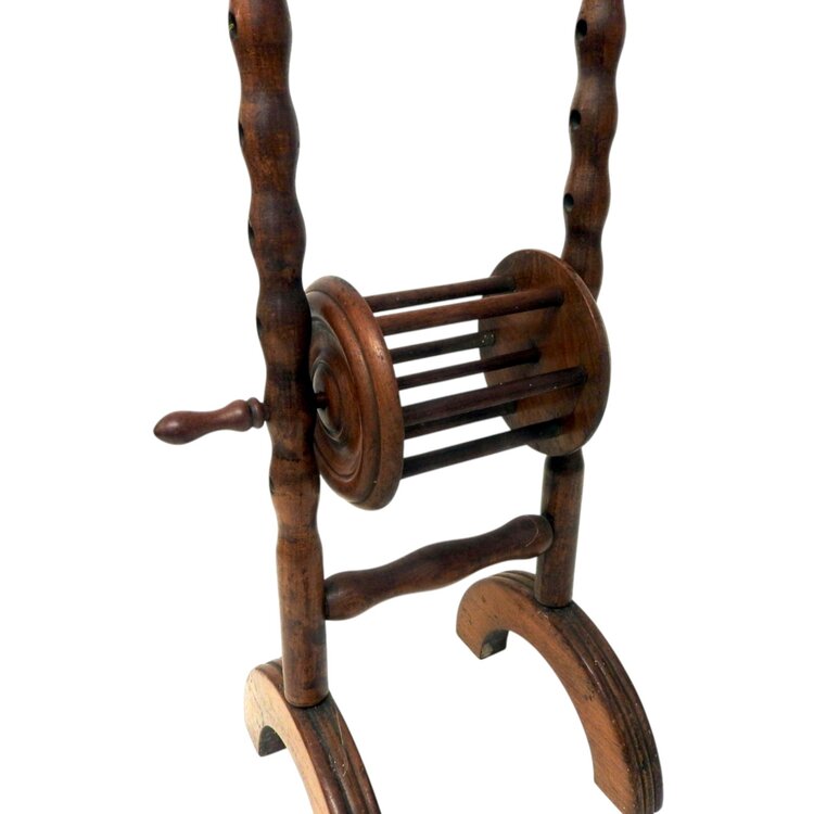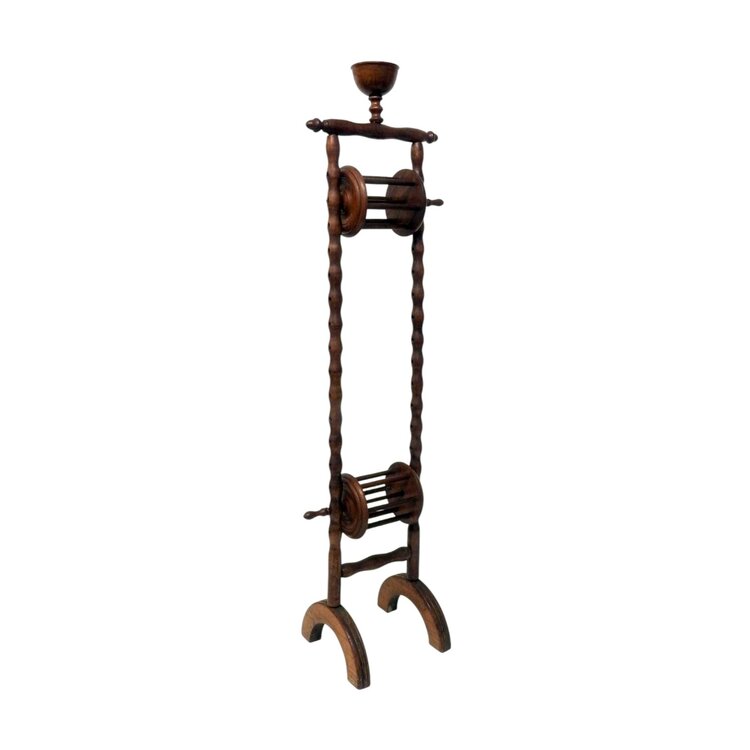Antieke donkerbruine houten wolwinder of wolhouder. Deze werd gebruikt om wol of garen van een streng tot een bol te winden. Datering ca. 1900. Conditie: in goede staat. Afmetingen: H. 115 cm, Br. 27 cm, D. 22 cm.