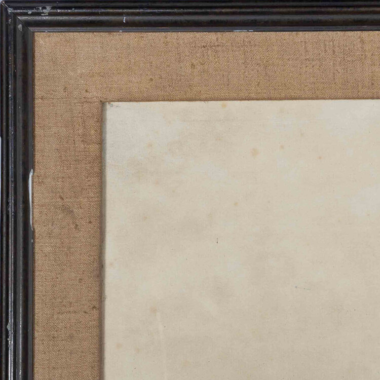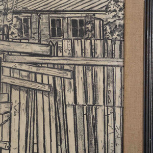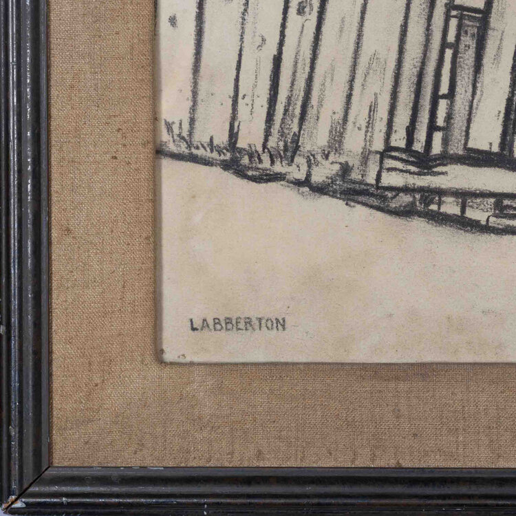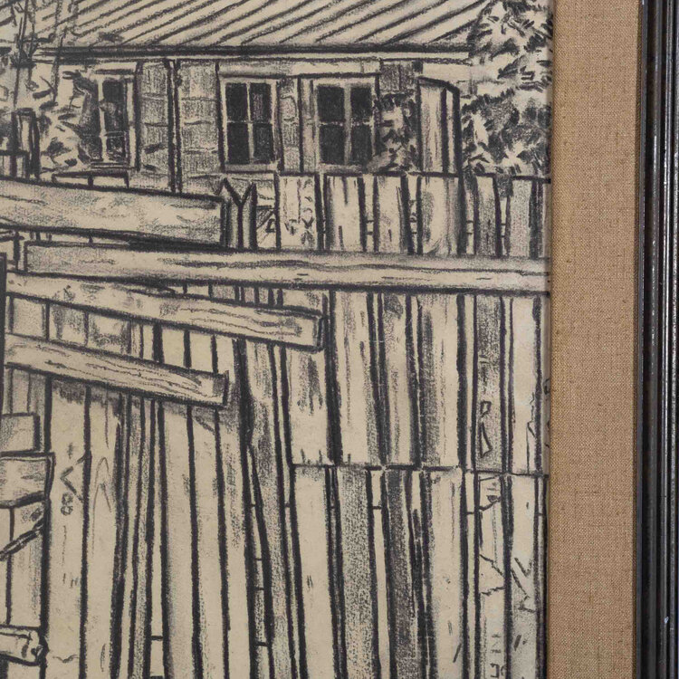 Anton Labberton (1904-1987), 'Straatgezicht' / 'Huizen van de rue d'Alésia', 1944. Houtskooltekening in houten lijst met afbeelding van een straatbeeld met schutting, bosjes en huizen. Het Kröller-Müller Museum heeft ook een werk van deze kunstenaar in de collectie. Signatuur linksonder. Conditie: papier is verkleurd, lijst is beschadigd. Afmetingen incl lijst: ca 72 x 57 cm.