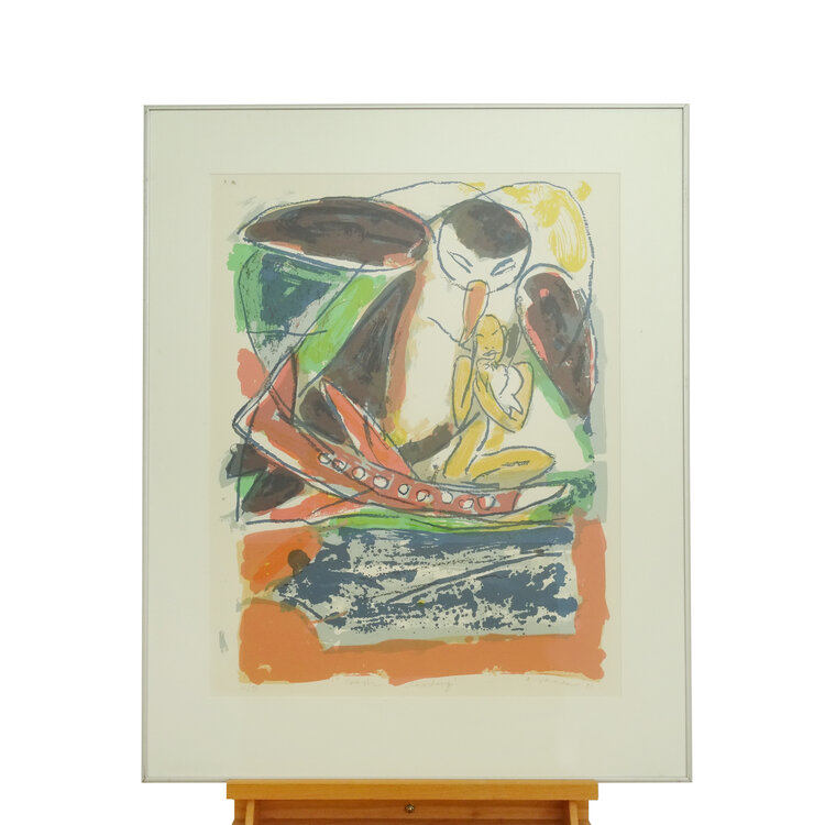 Anton Vrede, Crash landing, 1991. Zeefdruk in zilverkleurige lijst, oplage 21/51. Kleurrijke voorstelling met vliegtuig, grote vogel, en een menselijke figuur die een vogel vasthoudt.