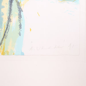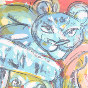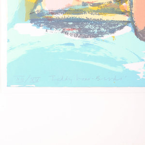 Anton Vrede, Teddy bear-birds, 1991. Zeefdruk, oplage 12/15. Kleurrijke voorstelling van knuffeldieren. Conditie: goed, gebruikssporen op lijst en plastic. Afmetingen: 56 x 75 cm.