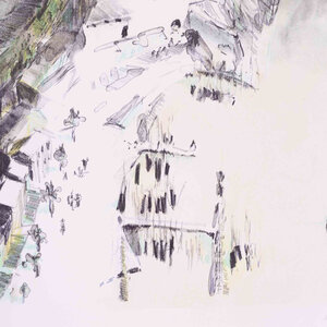 Ardi Brouwer, Zonder titel (Calvi), 1989. Litho zonder lijst, oplage 3/8. Afbeelding van Citadelle de Calvi in Corsica. Het is een bovenaanzicht op de rots met een straat, huizen en een jachthaven in zwart, grijs en groen. Signatuur rechtsonder. Conditie: papier is licht verkleurd. Afmeting papier: 66 x 50 cm.