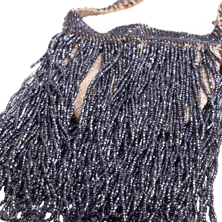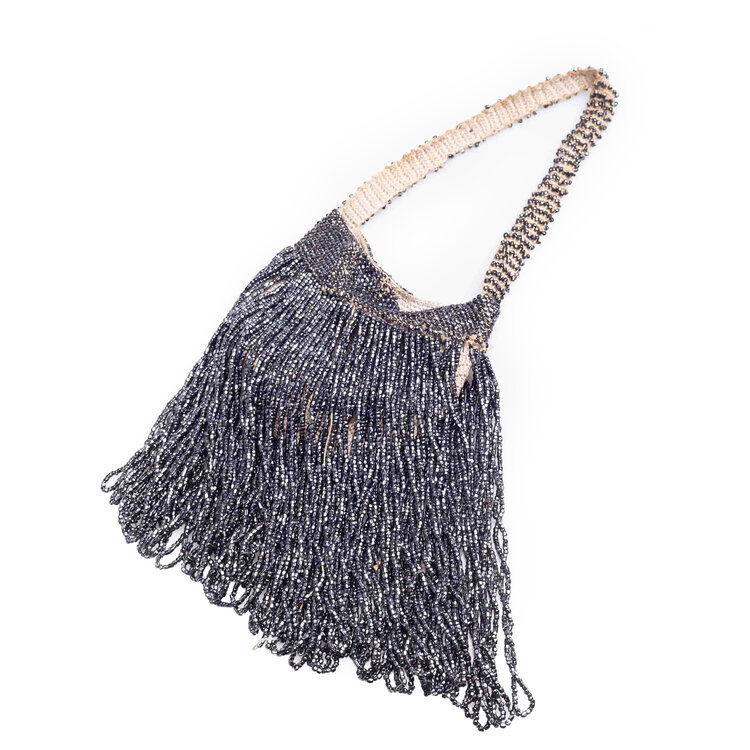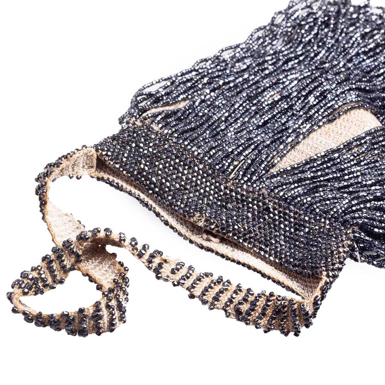 Gehaakt avondtasje met franjes van zwart geslepen kralen. De tas heeft een druksluiting en in het hengsel zijn rijen kralen mee-gehaakt. Datering: 1e helft 20ste eeuw. Conditie: hier en daar sporen van gebruik enouderdom, zoals vlekjes en losse kralen; maar nog in goede staat. Afmetingen ca.: 10 x 11 cm, hoogte incl hengsel is 30 cm.