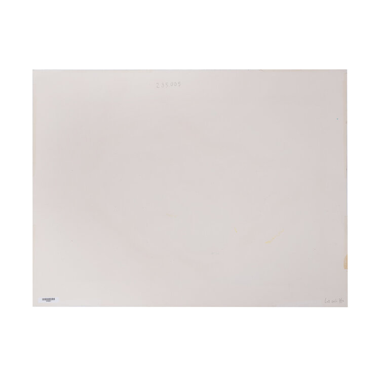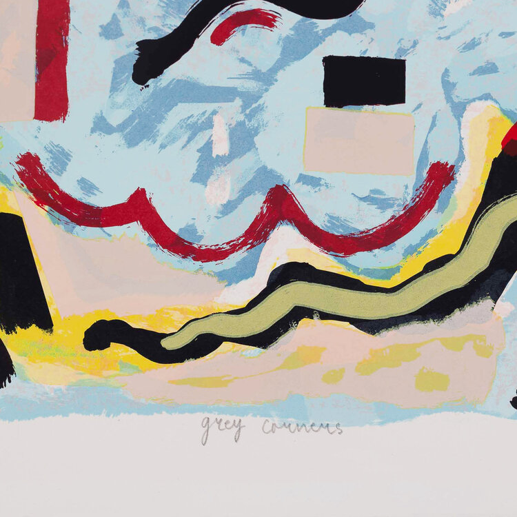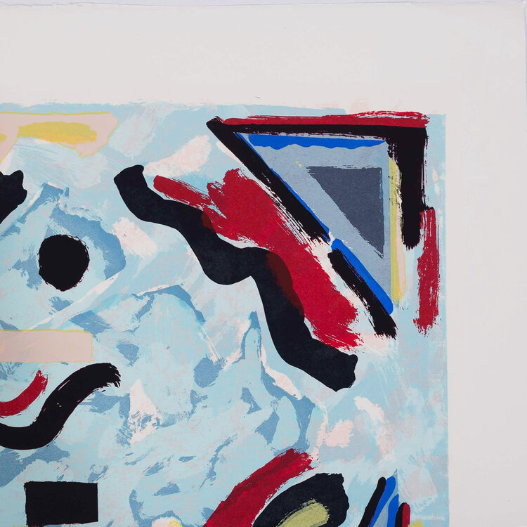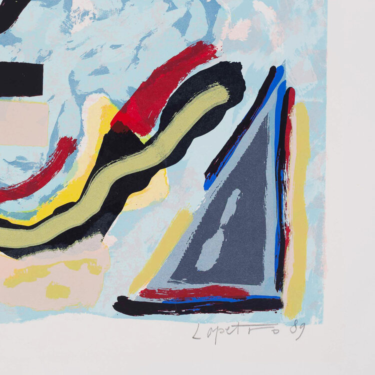 B. Lopetro, Grey corners, 1989. Zeefdruk op papier zonder lijst, oplage 7/30. Abstract werk van lijnen en vormen in verschillende kleuren tegen een blauwe achtergrond. Signatuur rechtsonder. Conditie: het papier toont gebruikssporen: er zit een klein scheurtje aan de onderkant van het werk, maar niet in de afbeelding; op de achterkant zitten resten van tape. Afmeting werk: 56 x 76 cm.