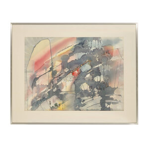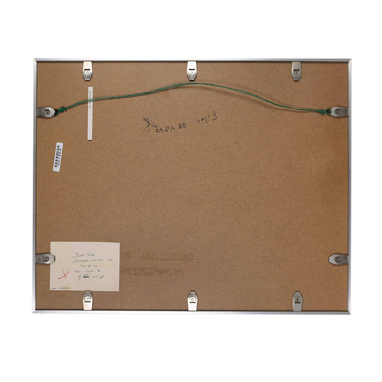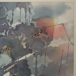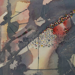 Bart Filet, Cycli II, 1991. Gemengde techniek op papier in metalen lijst. Abstracte voorstelling van kleurrijke vlakken en lijnen, linksonder een huisje met bomen. Rechtsonder signatuur en jaar. Conditie: goed, gebruikssporen aan lijst. Afmetingen: 60 x 75 cm.