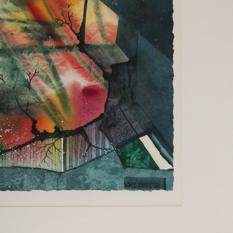 Bart Filet, Kaartenhuis, 1993. Aquarel in metalen lijst. Abstracte voorstelling van donkere kleuren met lichte accenten en hier en daar takken. Rechtsonder en jaar signatuur. Conditie: goed, gebruikssporen aan lijst. Afmetingen werk: 35 x 49 cm.