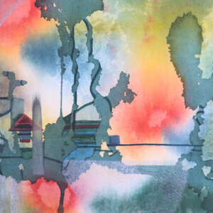 Bart Filet, Sporen, 1992. Aquarel in metalen lijst. Abstracte voorstelling in groen, rood en geel. Rechtsonder signatuur en jaar. Conditie: goed, gebruikssporen aan lijst. Afmetingen werk: 34 x 49 cm en lijst 50 x 65 cm.