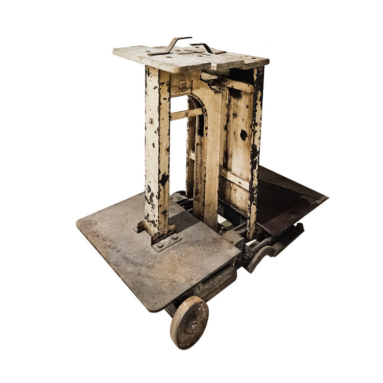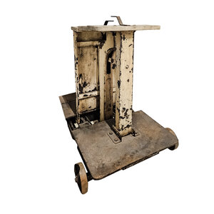 Bascuul, verrijdbaar, gemaakt van gietijzer en hout, voor het wegen van zakken. Plateau met verticaal schot of plateau waartegen de zak kan leunen. Aan de andere zijde van het schot is een 2e plateau om de gewichten op te zetten. Bovenop het schot, en bovenop een staander op het 2e plateau zijn horizontale latten van hout bevestigd, die bij het wegen langs elkaar schuiven. Als de 2 hierop gemonteerde wijzers op dezelfde hoogte staan is de bascuul in balans. Het weegmechanisme bevindt zich onder de plateaus. Datering: 1915-1935. Conditie: redelijk, geoxideerd. Afmetingen: ca. 56,6 x 93,5 x 77,0 cm.