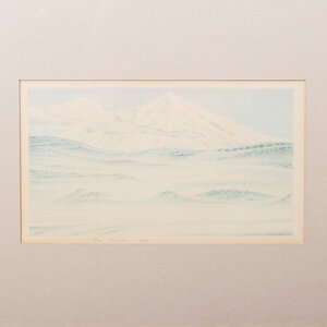 Ben Andrea, De Berg Ararat, 1983. Keurpotlood op papier in metalen lijst. Afbeelding van een landschap waar een witte berg uitsteekt met bewolking ervoor. Signatuur midden onder.
