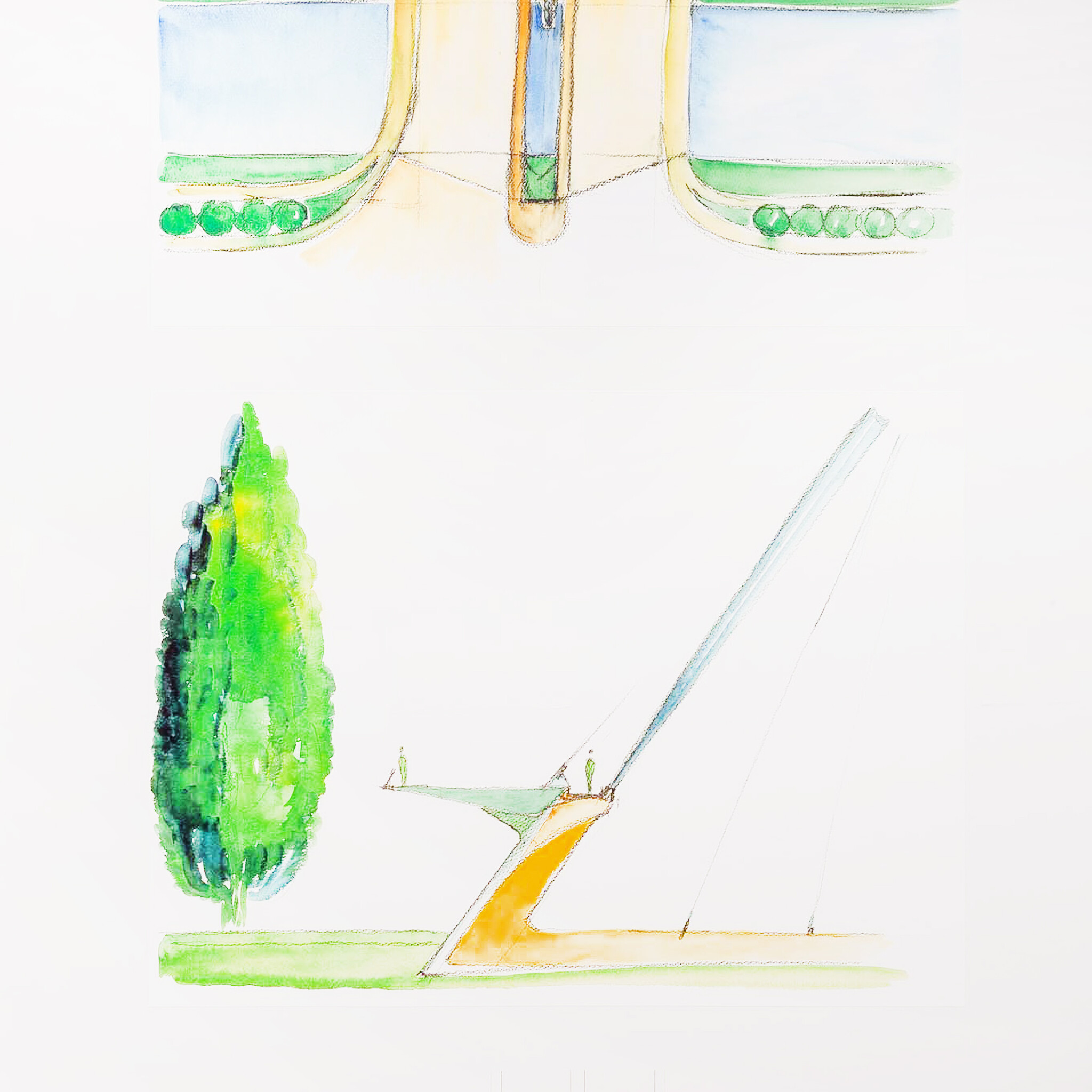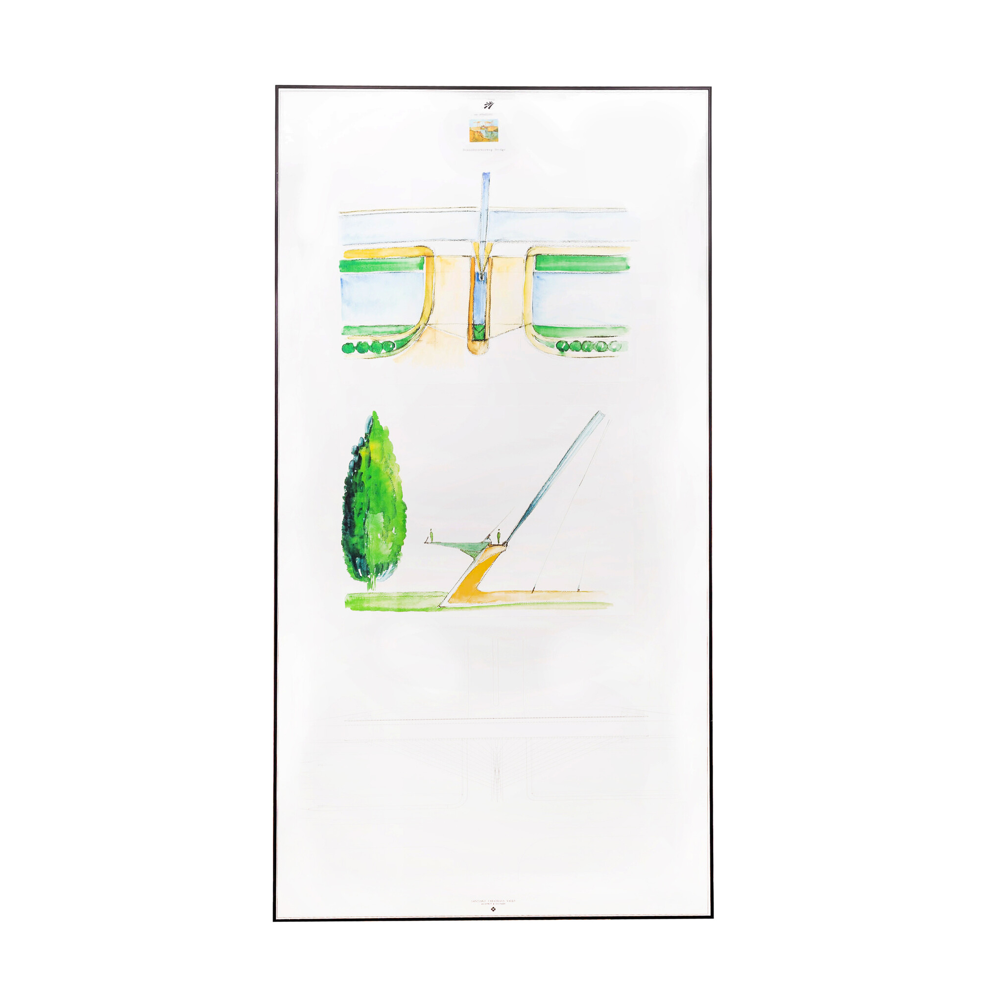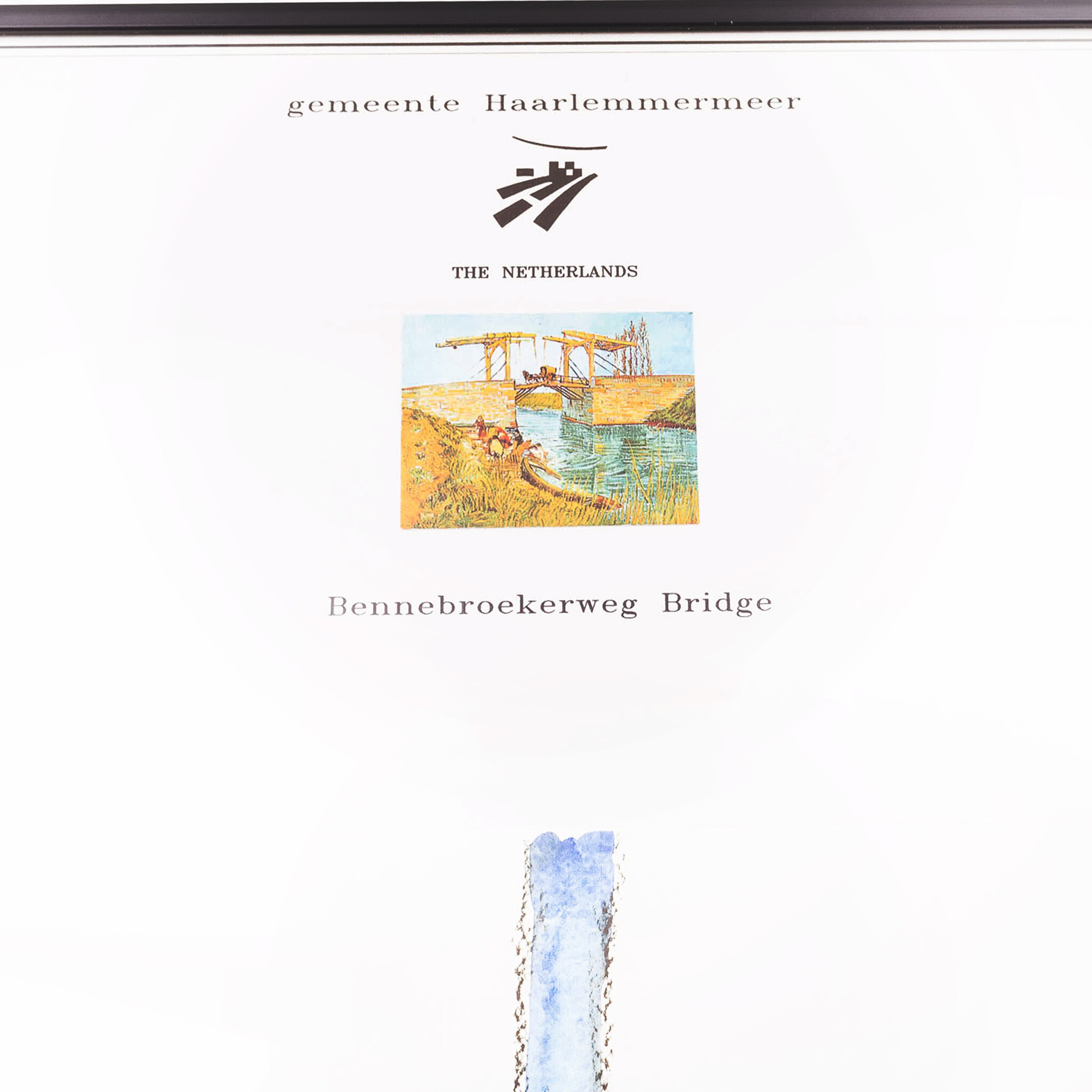 Bennebroekerweg Brug, Santiago Calatrava Falls. Afdruk van diverse schetsen en technische tekening van het bovenaanzicht van de Bennebroekerweg brug door architectenbureau Calatrava. Vermoedelijk gebruikt als presentatiemateriaal voor de Gemeente Haarlemmermeer. Ingelijst in zwarte lijst met plexiglas. Datering: onbekend. Conditie: goed, alleen wat krassen op het plexiglas. Afmetingen: ca. 180 x 90 cm.