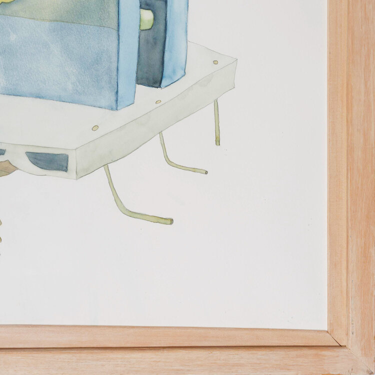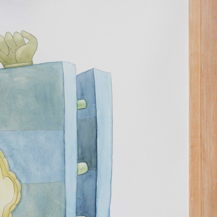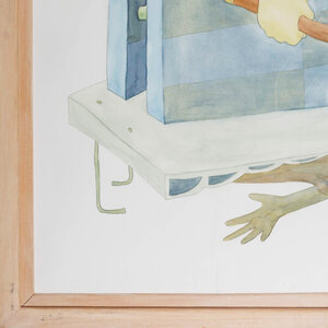 Bernard Divendal, 'Onnut, direct', datering onbekend. Tekening in houten lijst met kunststof plaat. Afbeelding van twee koppen, waarvan de monden en beide handen via een stengel met elkaar verbonden zijn. Boven en onder steken handjes uit. In de kleuren blauw, groen en geel. Signatuur ontbreekt. Divendal woont en werkt in Groningen. Conditie: lijst vertoont gebruikssporen. Afmetingen incl lijst: ca 101 x 126 cm.