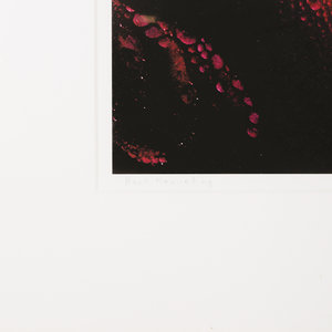 Bert Houweling, Roos 17, 2002. Kleurenfoto in houten lijst, oplage 7/16. Close-up van een rode roos bedekt met waterdruppels. Linksonder signatuur, rechtsonder titel, jaartal en oplagenummer. Conditie: goed, gebruikssporen aan lijst. Afmeting lijst: 73 x 88 cm.