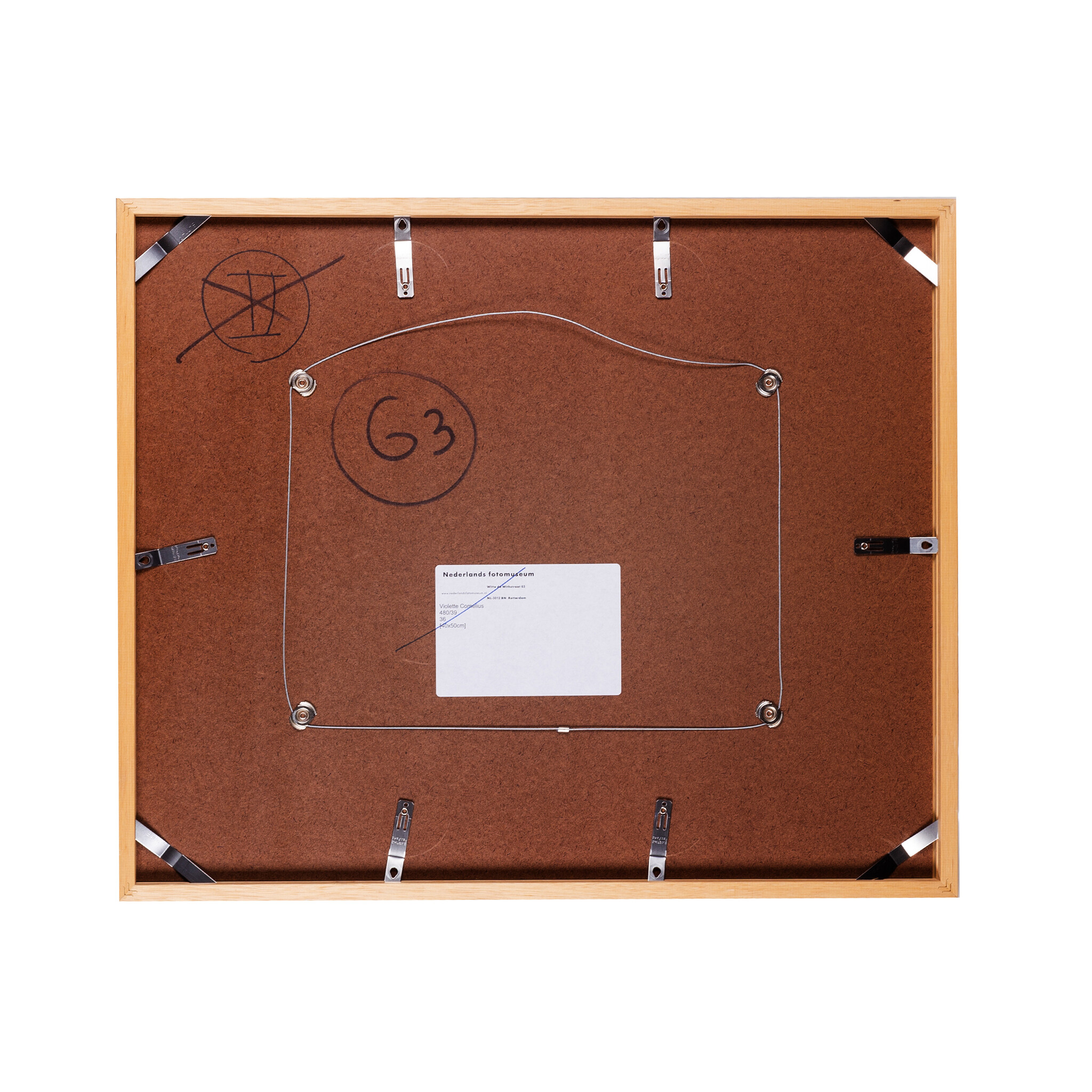 Stevige blankhouten wissellijst met helder glas voor een werk van 50 x 60 cm. Binnenmaat aan de voorzijde is 49 x 59 cm. De lijst is gebruikt bij een expositie van het Nederlands Fotomuseum. Conditie: lichte gebruikssporen aan de lijst, zoals vlekjes en aan de achterzijde tekst. Afmeting buitenmaat: ca. 53 x 63 x 3 cm.