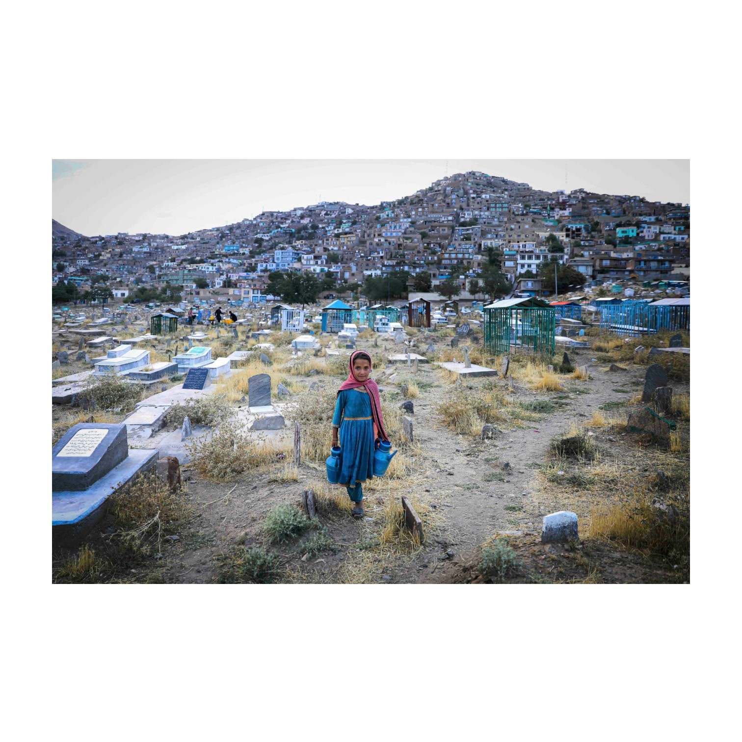 Salema', 17-7-2020De zevenjarige Salema wacht op klanten om water te verkopen op de Kart-e Sakhi-begraafplaats in Kabul. Kinderen verkopen water op begraafplaatsen aan bezoekers om op de graven van hun familieleden te gieten, een oude traditie waarvan wordt aangenomen dat deze helpt om de zonden van de doden te verzoenen. |