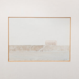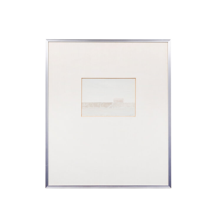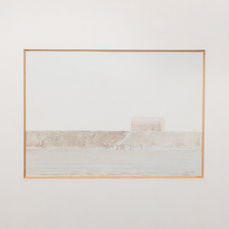 Bob Nieuwenhuysen (Amsterdam, 1946 - 2010), 'Dijkhuisje'. Aquarel op papier in metalen lijst met passe-partout. Afbeelding van een dijk met huisje in blauw- en bruintinten. Signatuur rechtsonder. Datering: 1980. Conditie: gebruikssporen lijst, verkleuring passe-partout. Afmetingen lijst: 43 x 36 cm; beeldvlak: 11 x 15 cm.
