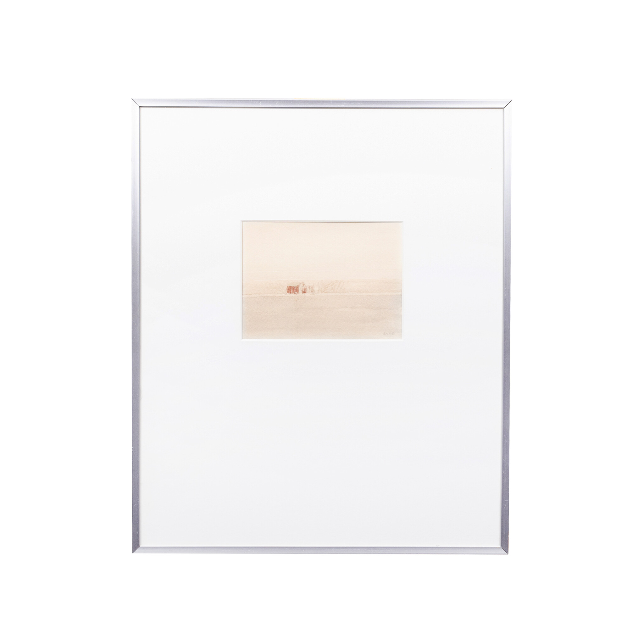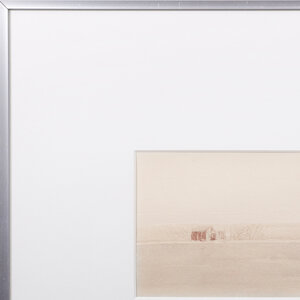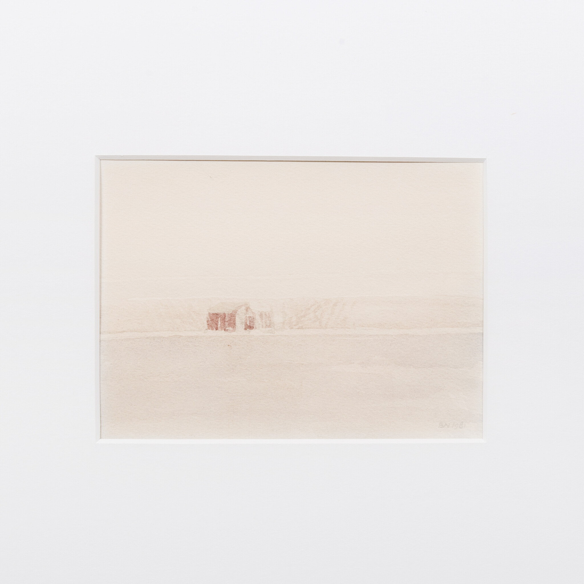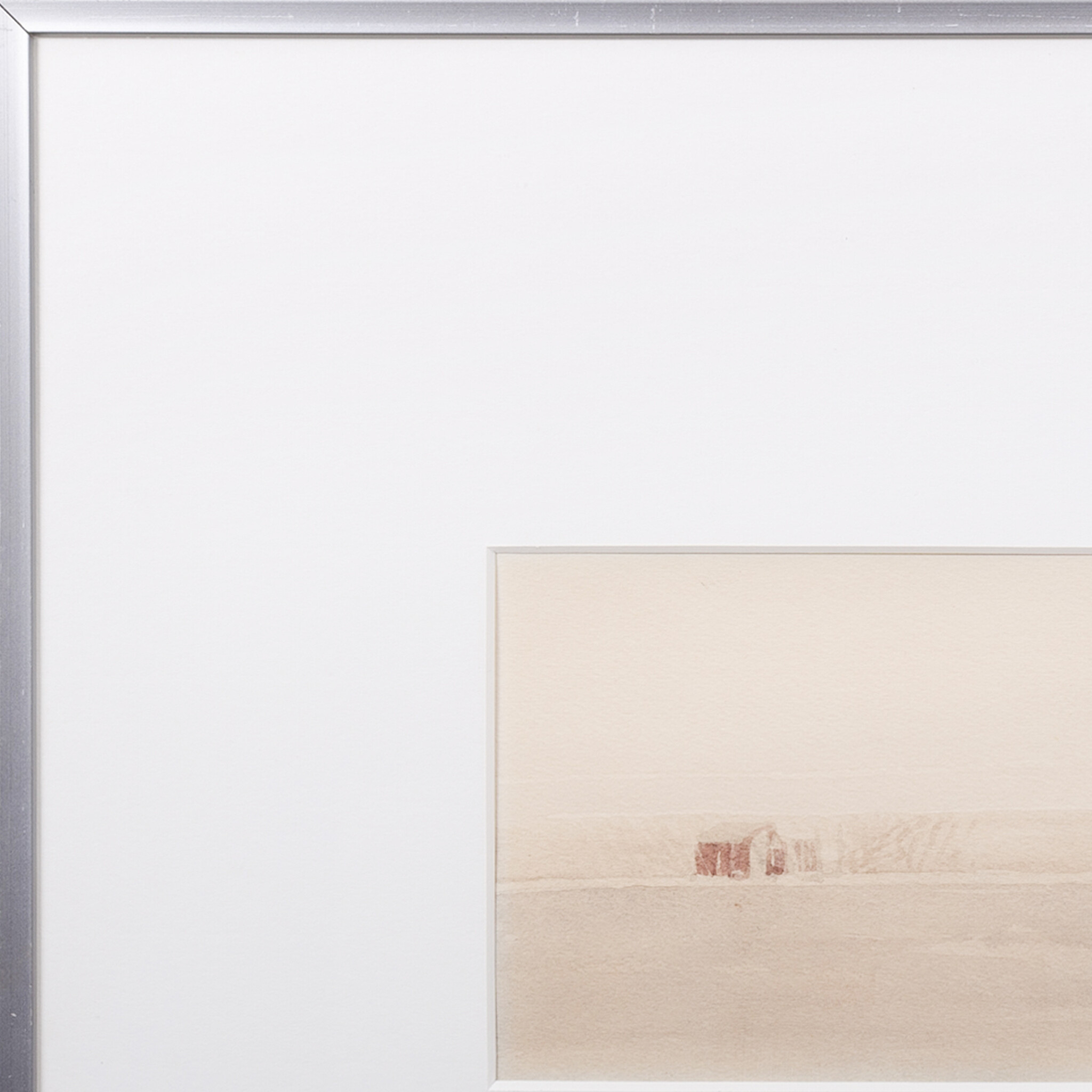 Bob Nieuwenhuysen (Amsterdam, 1946 - 2010), 'Polderlandschap III'. Aquarel op papier in metalen lijst met passe-partout. Afbeelding van een landschap met een hutje in bruintinten. Signatuur rechtsonder. Datering: 1981. Conditie: verkleuring werk, gebruikssporen lijst. Afmetingen lijst: 43 x 36 cm; beeldvlak: 11 x 15 cm.