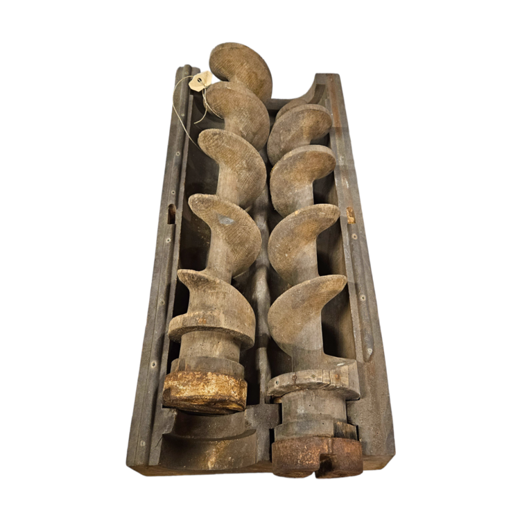 Houten wormmolen, vermoedelijk een onderdeel van een boterverkappingsmachine. De wormen werden gebruikt voor het transport van de boter vanuit de machine naar een mal. Vervolgens werd de boter uit de mal gehaald en in plakken verdeeld die ingepakt en verkocht konden worden. Datering: onbekend. Conditie: gebruikt. Afmetingen: circa 65 x 29 x 15 cm (lengte x breedte x hoogte).