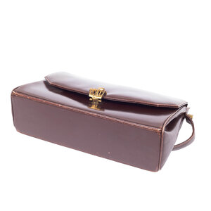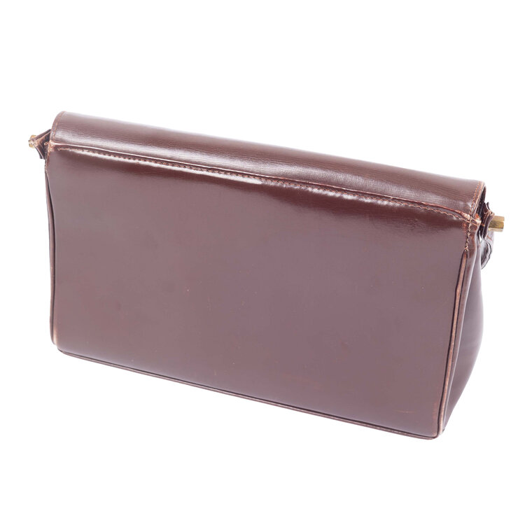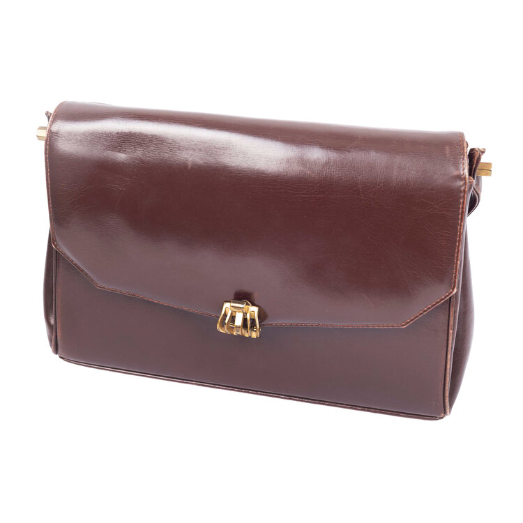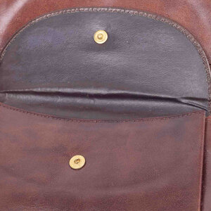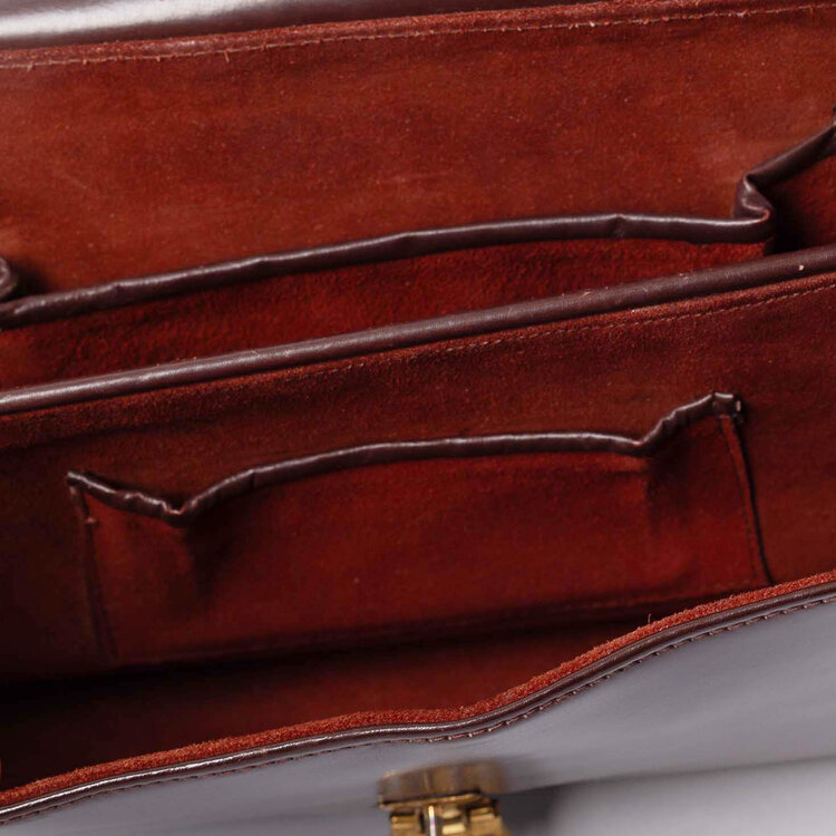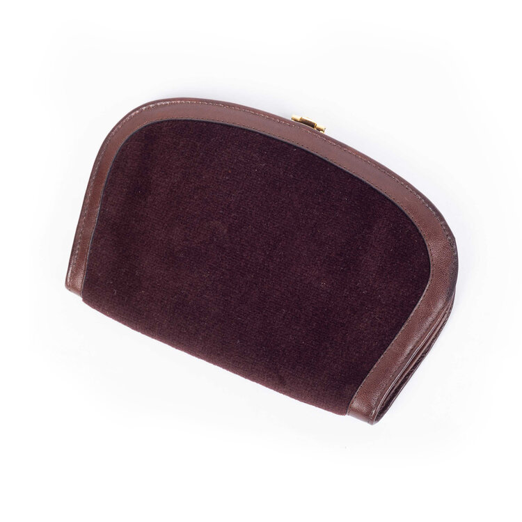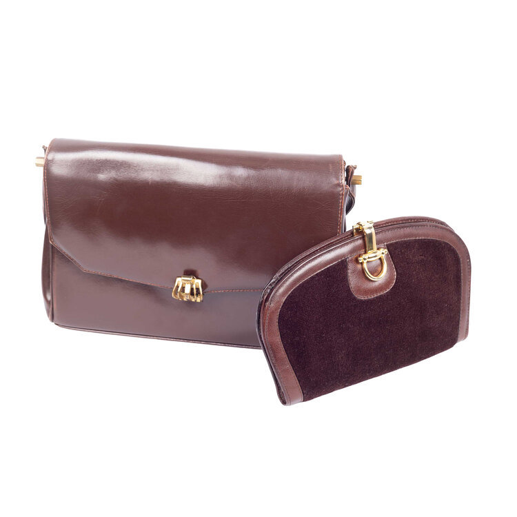 Vintage bruine handtas met portemonnee van imitatieleer. De tas heeft een charmante druksluiting en is aan de binnenzijde gevoerd met imitatie suède. De portemonnee is van bruin velours met imitatieleer en is in 1975 gekocht bij Maison de Bonnetterie. Conditie: beide zijn in goede conditie. Het tasje toont hier en daar lichte gebruikssporen, maar de portemonnee is nog in nieuw-staat. Afmetingen tas: 24 x 16 cm x 7 cm; portemonnee: 18 x 12 x 2 cm.