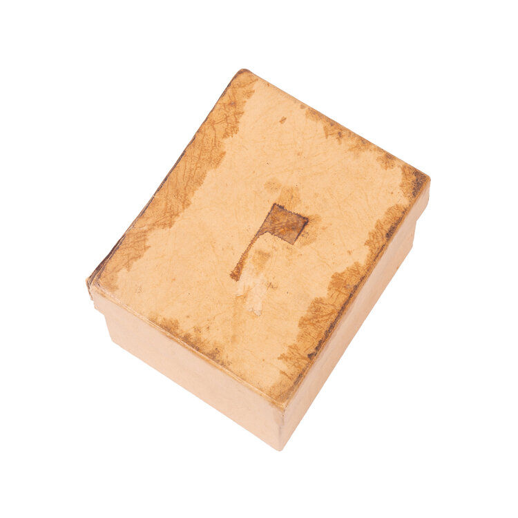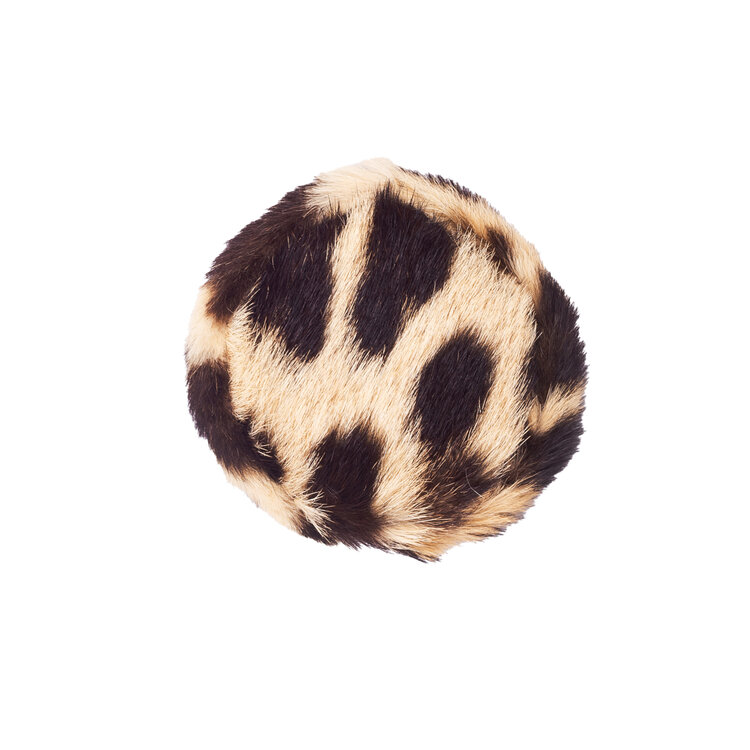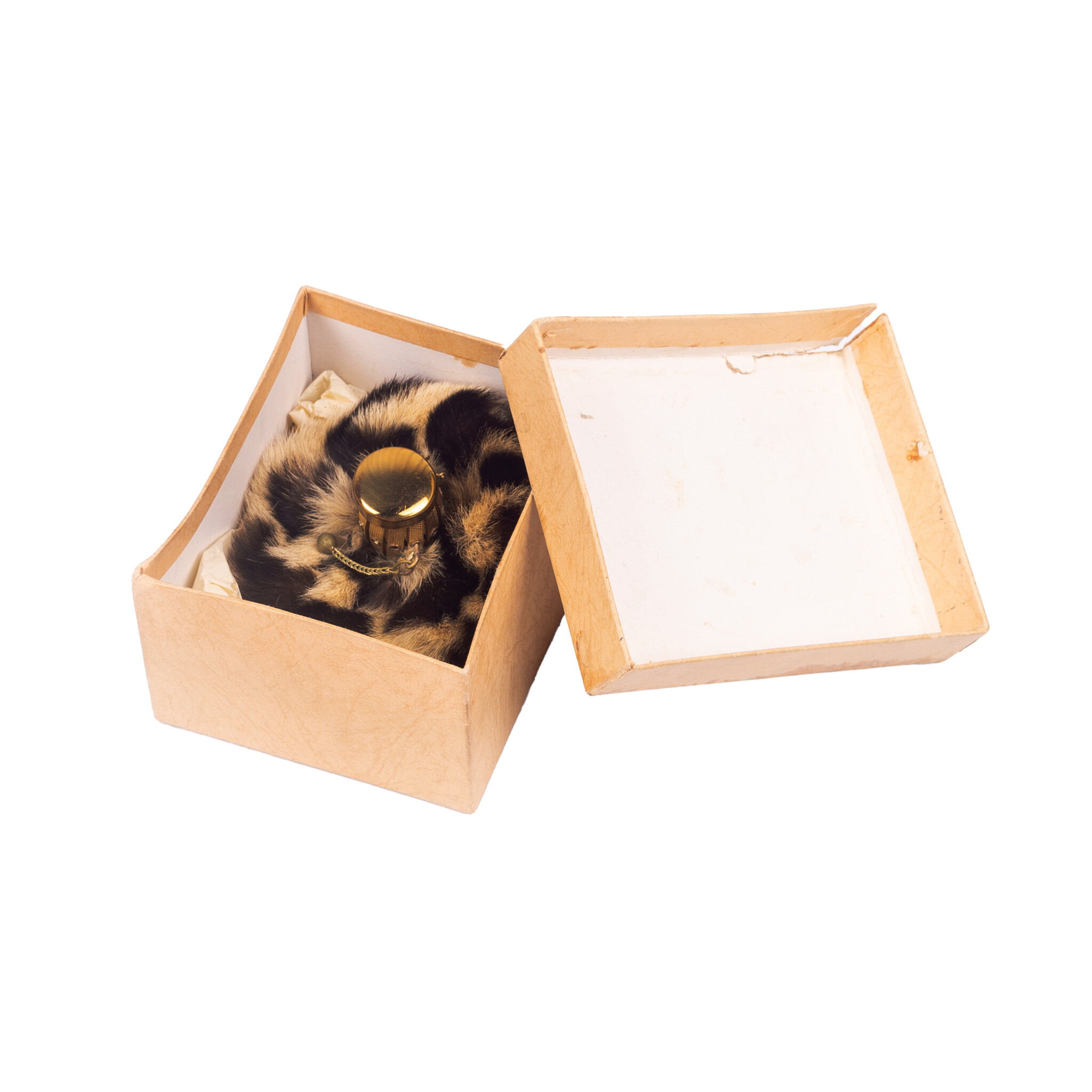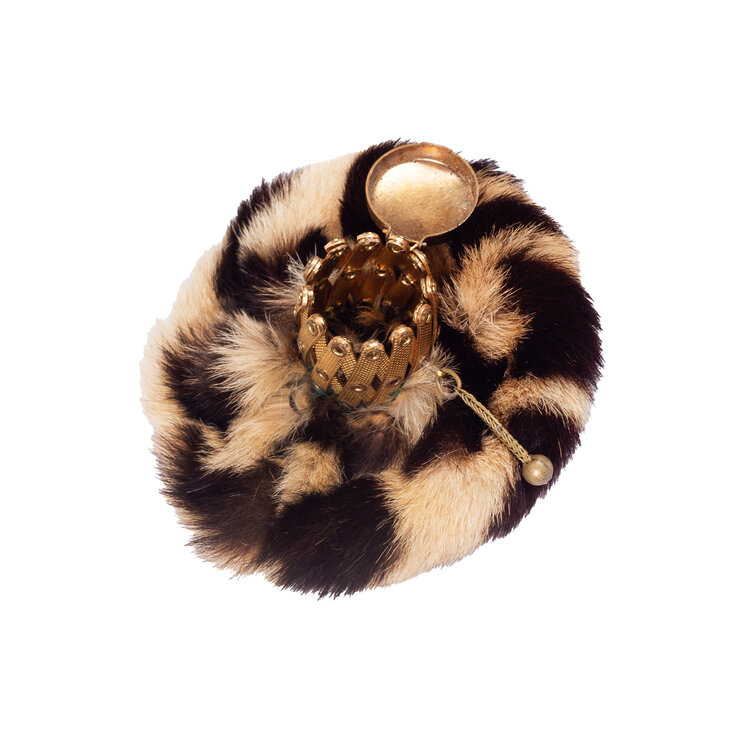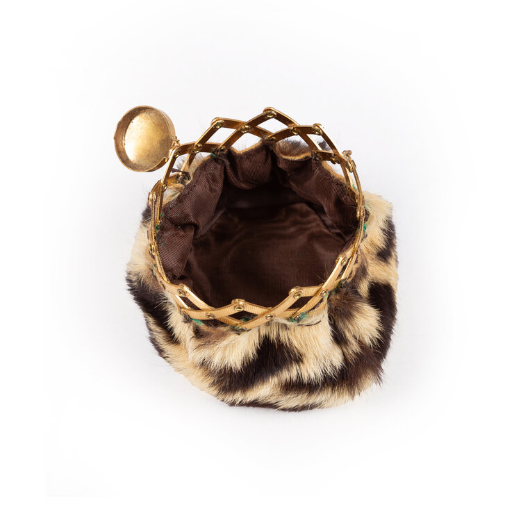 Een buidel van luipaardvacht, gevoerd, met uitvouwbare goudkleurige harmonica-sluiting. Datering: onbekend. Conditie: gebruikssporen, oxidatie metaal (groene aanslag op messing). Afmetingen: ca 8 x Ø 9 cm.