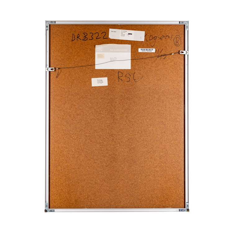 Cees Kortlang, Aran port, 1986. Ets in metalen lijst, oplage 11/12. Abstracte voorstelling van twee rode vormen voor een zwart-witte achtergrond. Linksonder oplagenummer, in midden titel en rechtsonder signatuur en jaartal. Conditie: goed, gebruikssporen aan lijst. Afmeting werk zonder lijst: 63 x 47 cm.