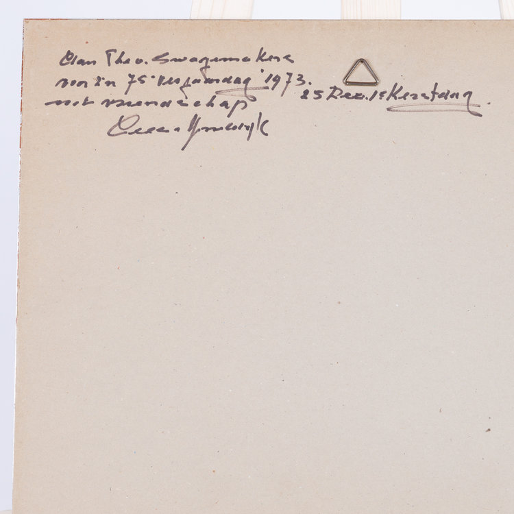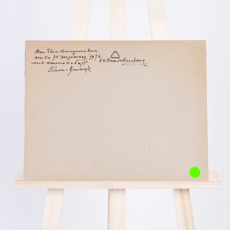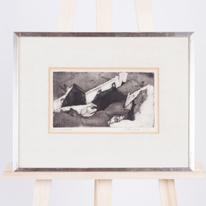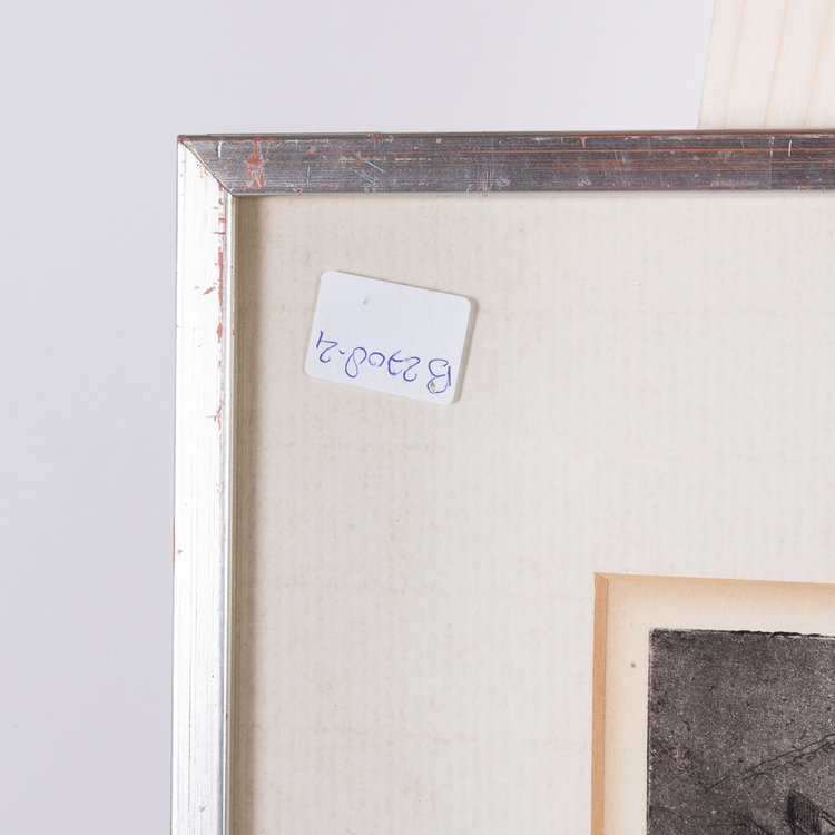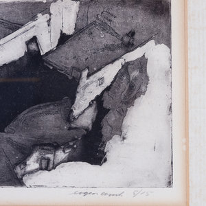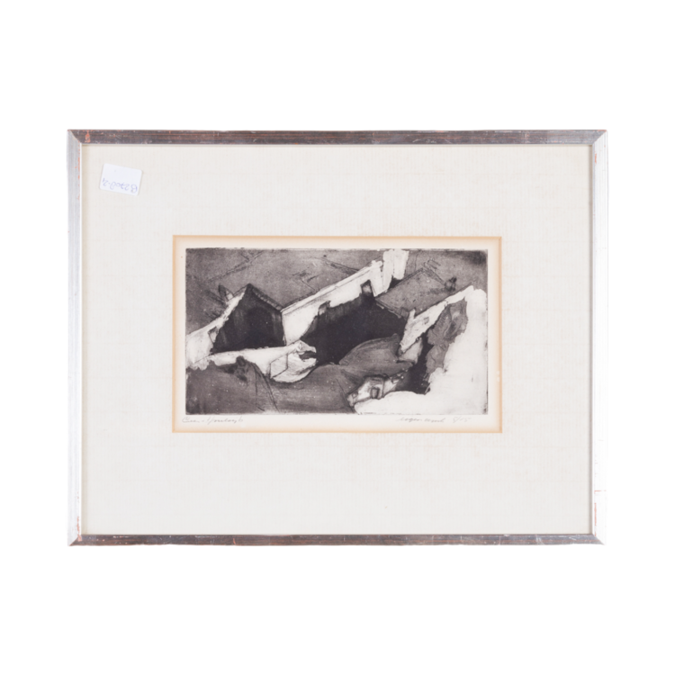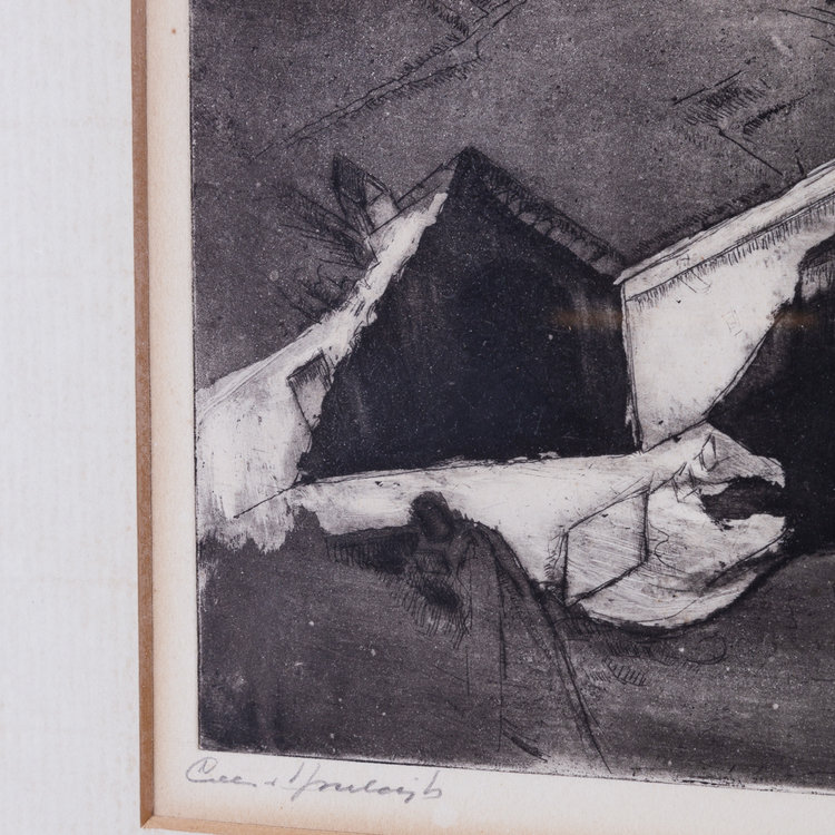 Grafisch werk in zwart-wit met een geabstraheerde voorstelling. Het is mogelijk een ets waarin met tonen is gewerkt op de plaat. Eigen druk 1/15. Het werk is ingelijst achter glas met passe-partout. Cees van IJsseldijk (1901-1977) vervaardigde schilderijen en grafiek. Hij was onder andere lid van kunstenaarsvereniging Sint Lucas. Datering: ca. 1920-77. Conditie: het werk is in redelijke conditie. Het papier is verkleurd en heeft enkele vlekjes. De lijst heeft gebruikssporen. Afmetingen: lijst ca. 35 x 45 cm, werk ca. 16 x 27 cm.